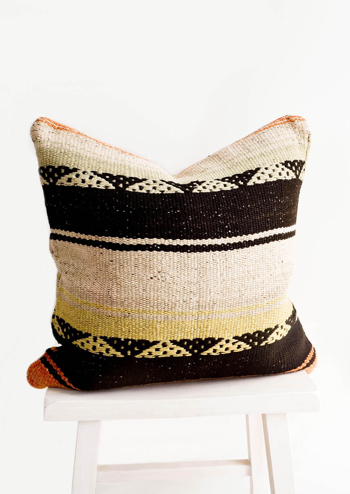 Traditional Bolivian textiles known as frazadas have been hand-woven in the Andes since pre-Hispanic times, traditionally used to protect against the high-altitude cold. Reinvented in the form of a throw pillow, these colorful creations add an instant hit of worldly character. This pillow features the same fabric on both sides, in a color palette of beige, black, yellow, orange and sage green.