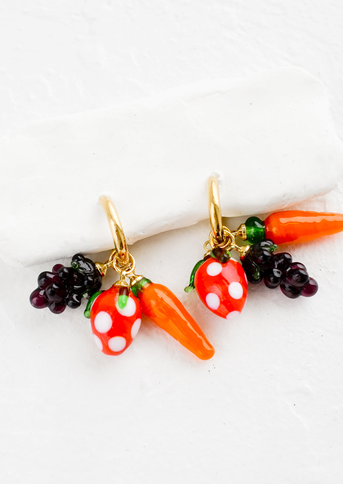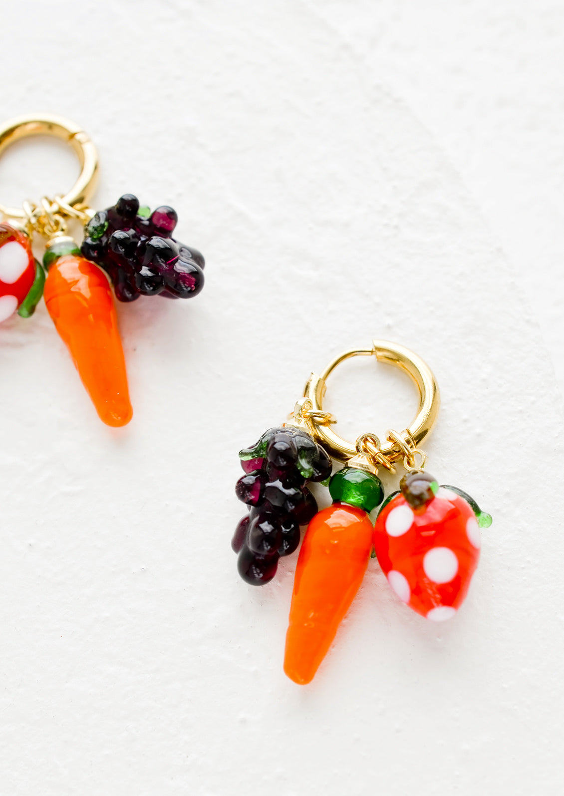 A delicious juice is embodied in these handmade hoops, charmed by glass grapes and some fruit and veggie friends—all three charms are removable and can be mixed and matched, grouped together, or worn solo.