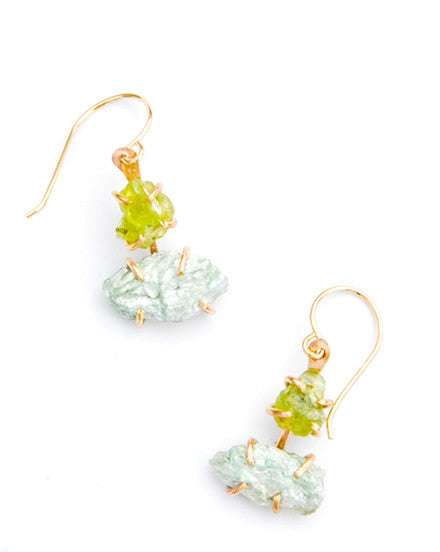Raw, untreated gemstones in coordinating color families hang from delicate golden ear wires on these drop earrings from Alana Douvros.