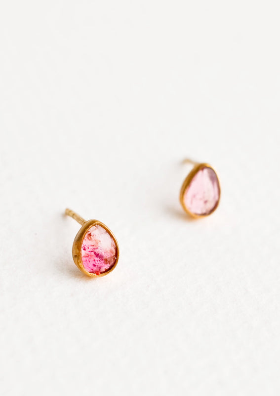 Natural watermelon tourmaline, in its fascinating array of hues, is beautifully showcased in these studs. Framed in recycled brass and featuring ever-so-imperfect shapes, they feel decidedly organic in the prettiest, most effortless way.