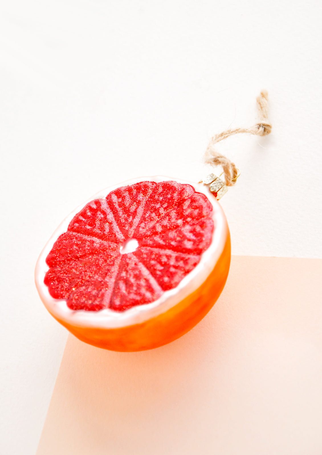 A juicy, sliced grapefruit takes form in colorful painted glass on this holiday ornament, perfect for the winter season.