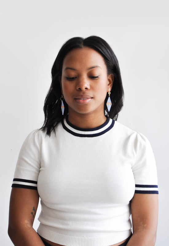 Beaded triangles in a mix of bright, iridescent, and metallic glass hang from an easy-to-wear post back silhouette. From Bluma Project.