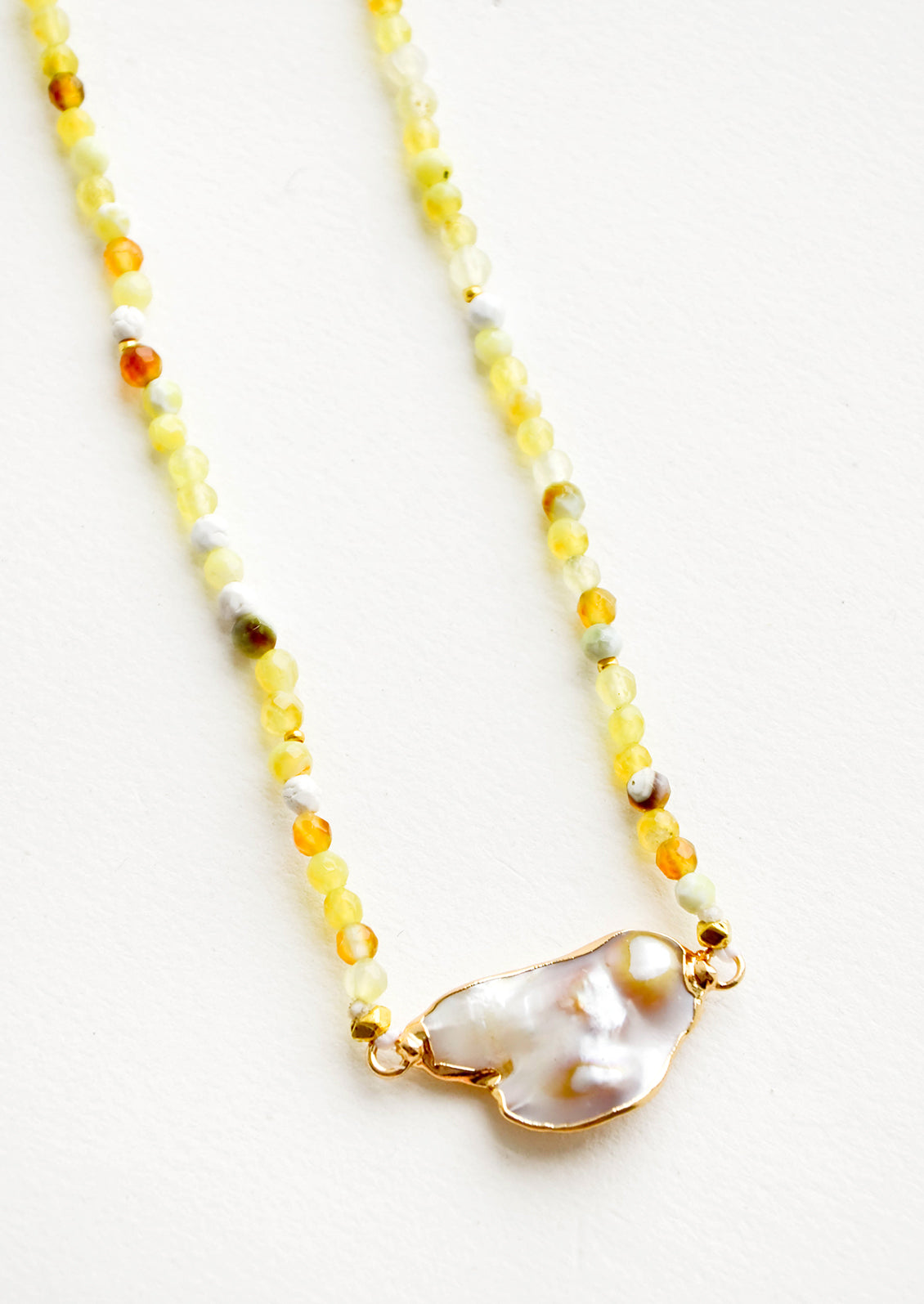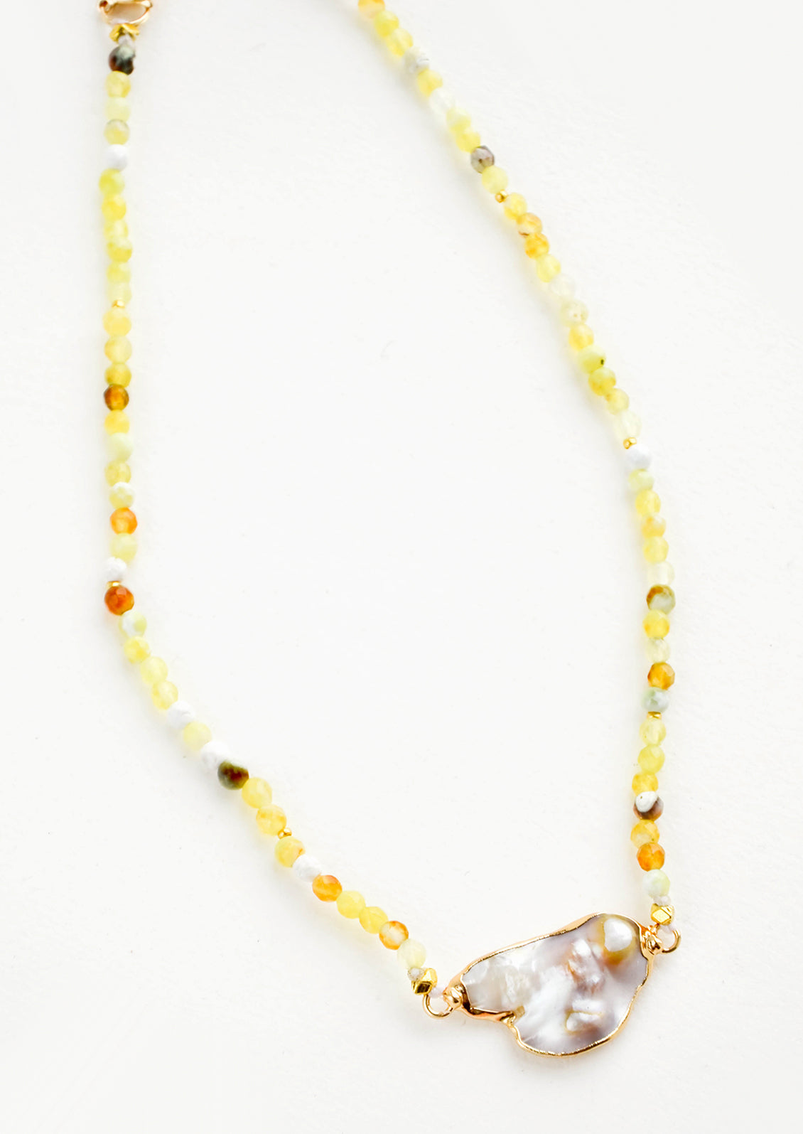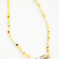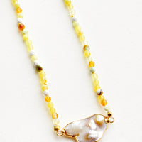 Gemstone beads in a beautifully variegated array of citron yellow, amber, white, grey and green steal the show on this adjustable necklace (wear it as a choker or a 16" necklace). A perfectly imperfect grey freshwater pearl stands front and center.