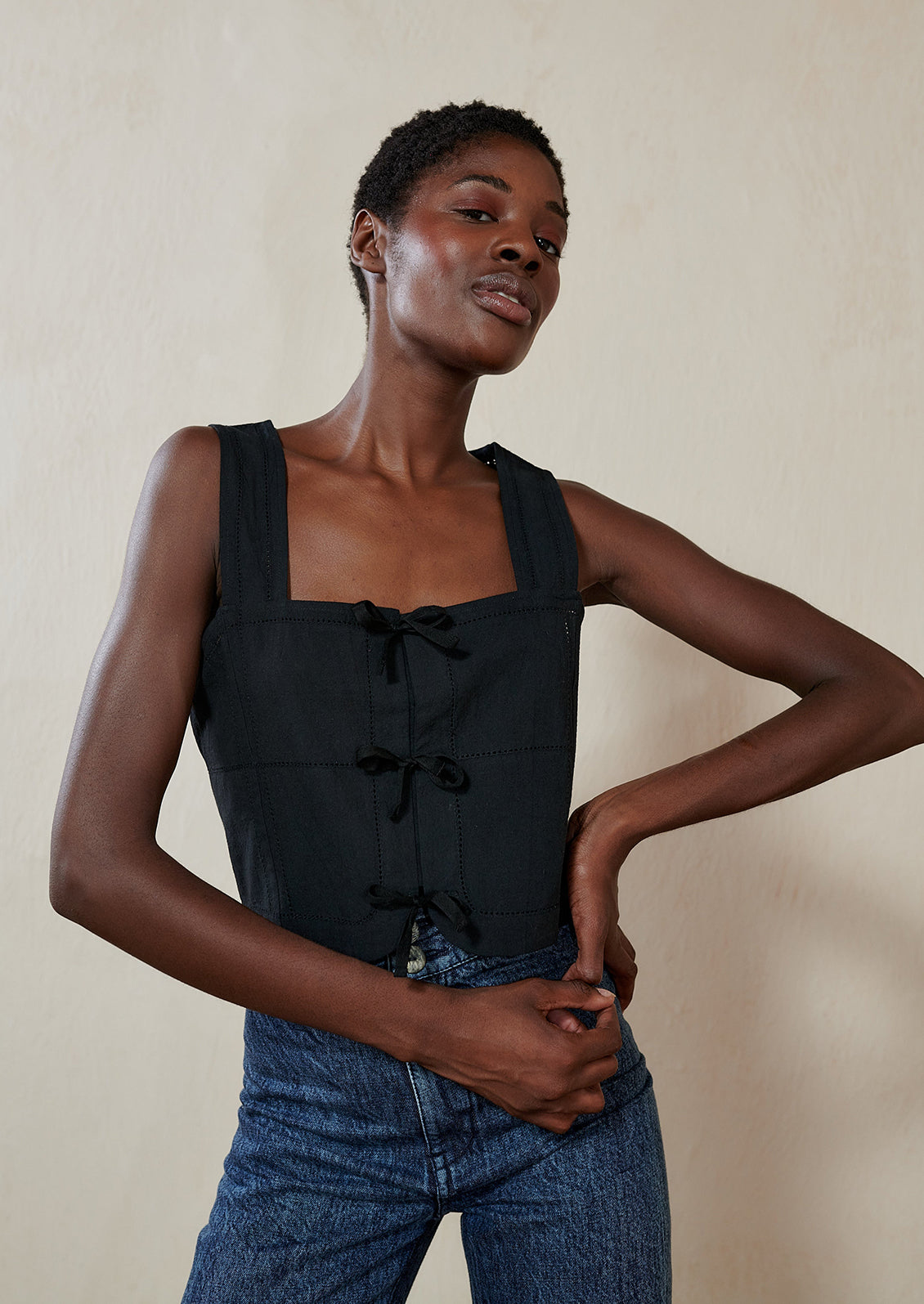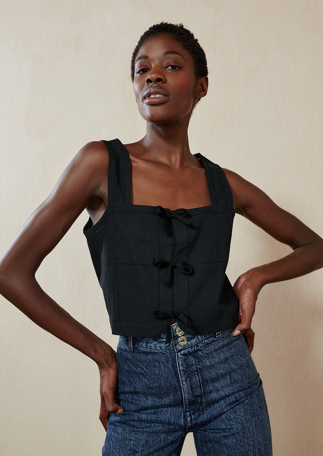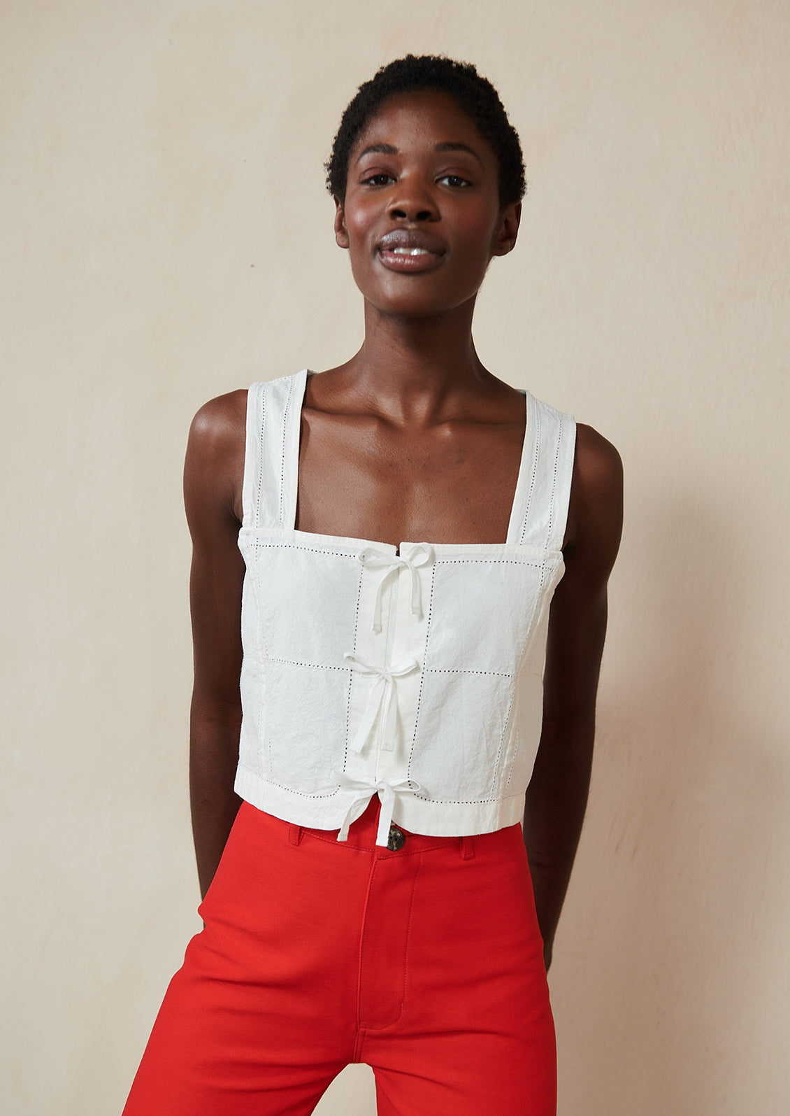 Designed with a square neckline, wide straps and a sweet tie front, Maria Stanley's "Hosta" top features antique inspired detailing and a bra-friendly opening with a hidden inner placket.