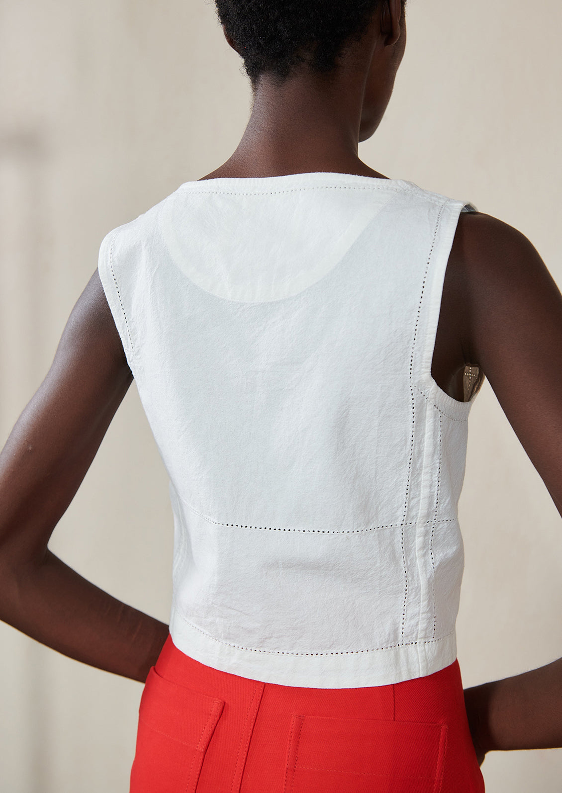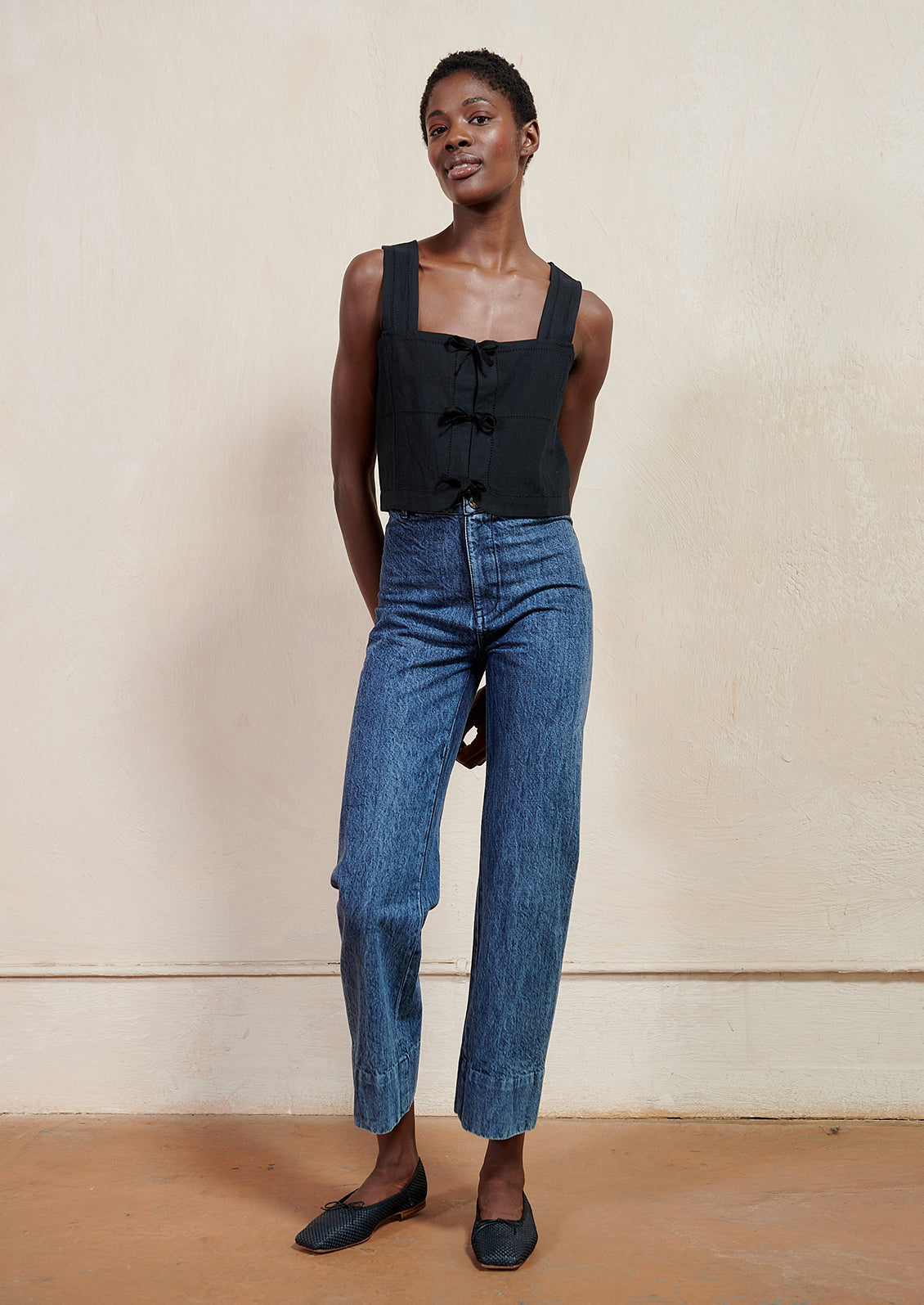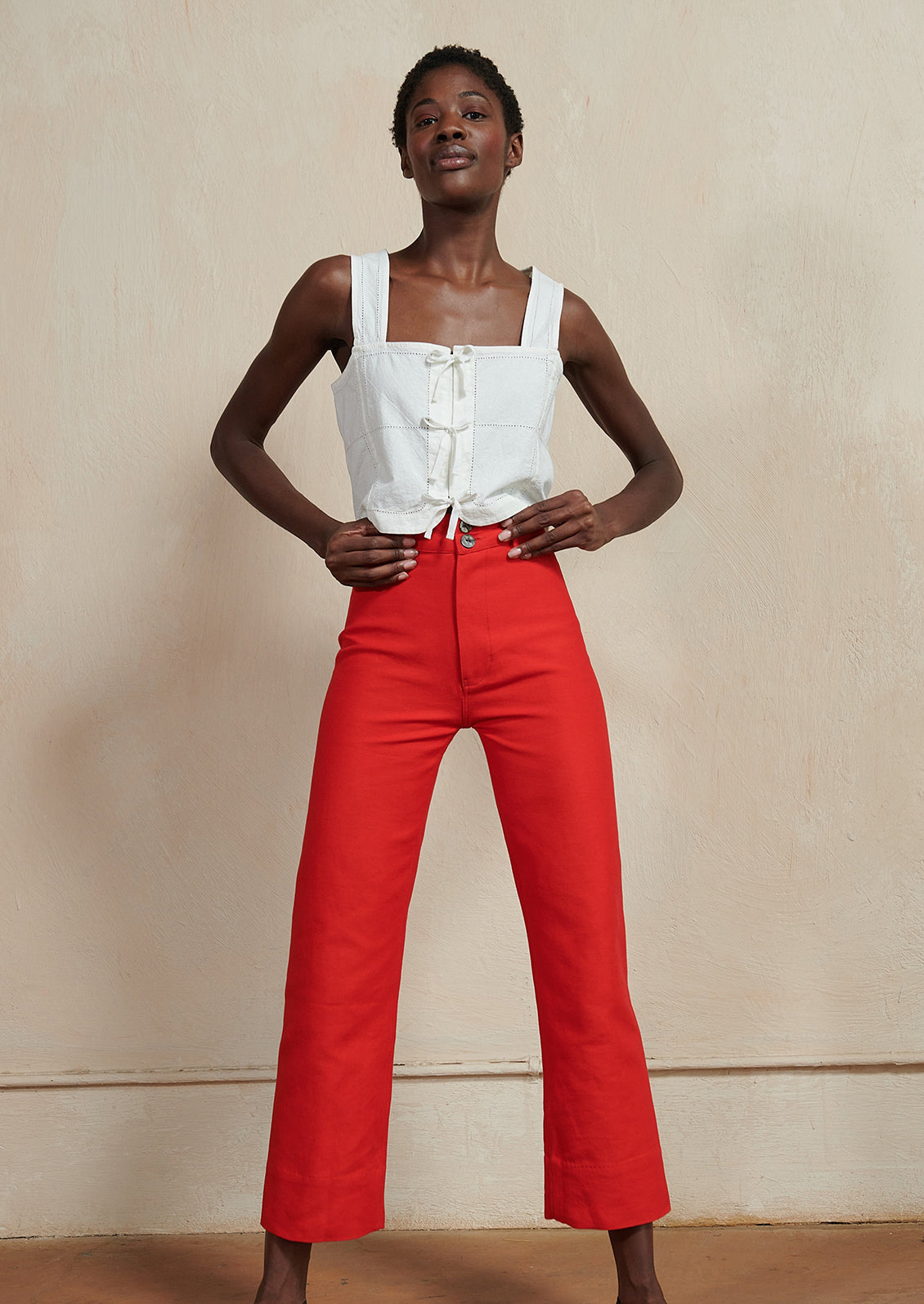 Designed with a square neckline, wide straps and a sweet tie front, Maria Stanley's "Hosta" top features antique inspired detailing and a bra-friendly opening with a hidden inner placket.