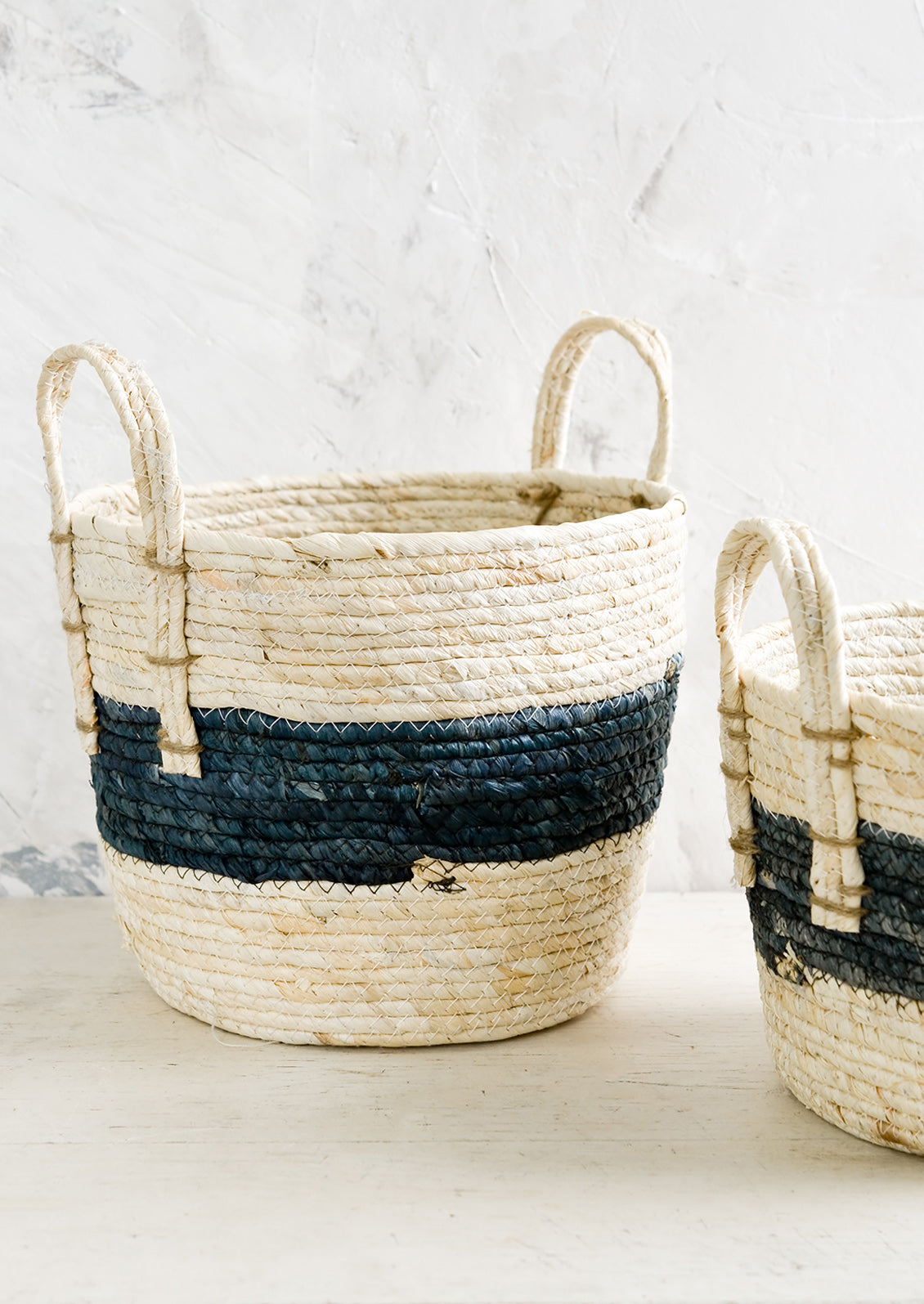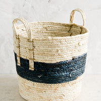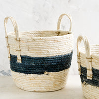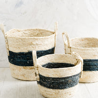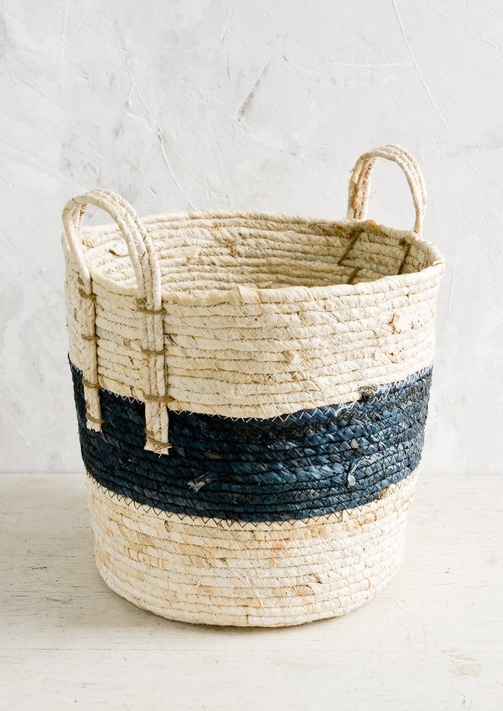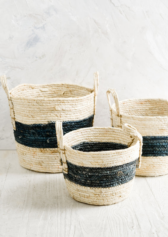 Woven in natural maize with a striking indigo band around its center, this classic storage basket offers convenient organization—all three sizes nest inside one another for consolidated storage.