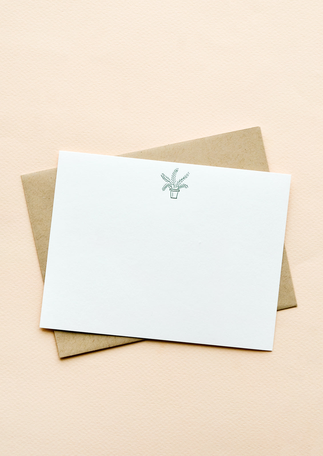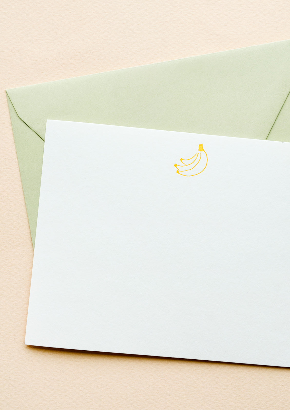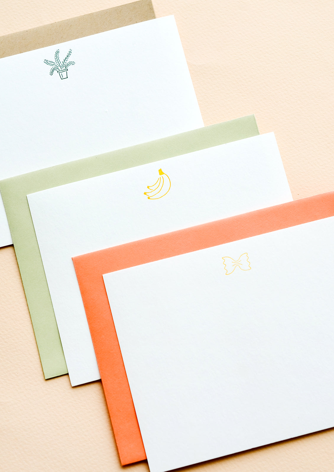 Printed with a simple, playful icon, these informal notecards are paired with colorful or classic envelopes for coordinated correspondence.