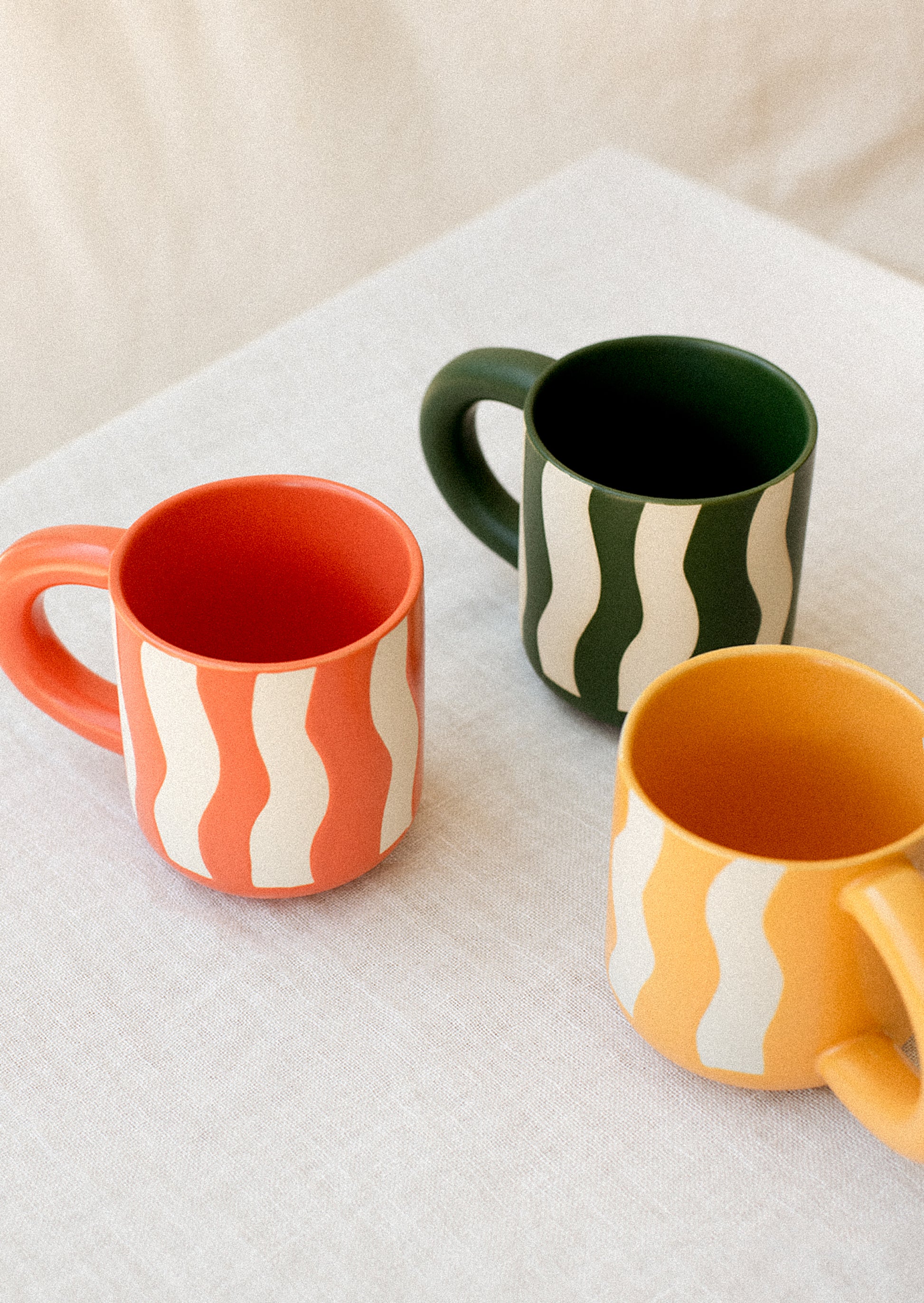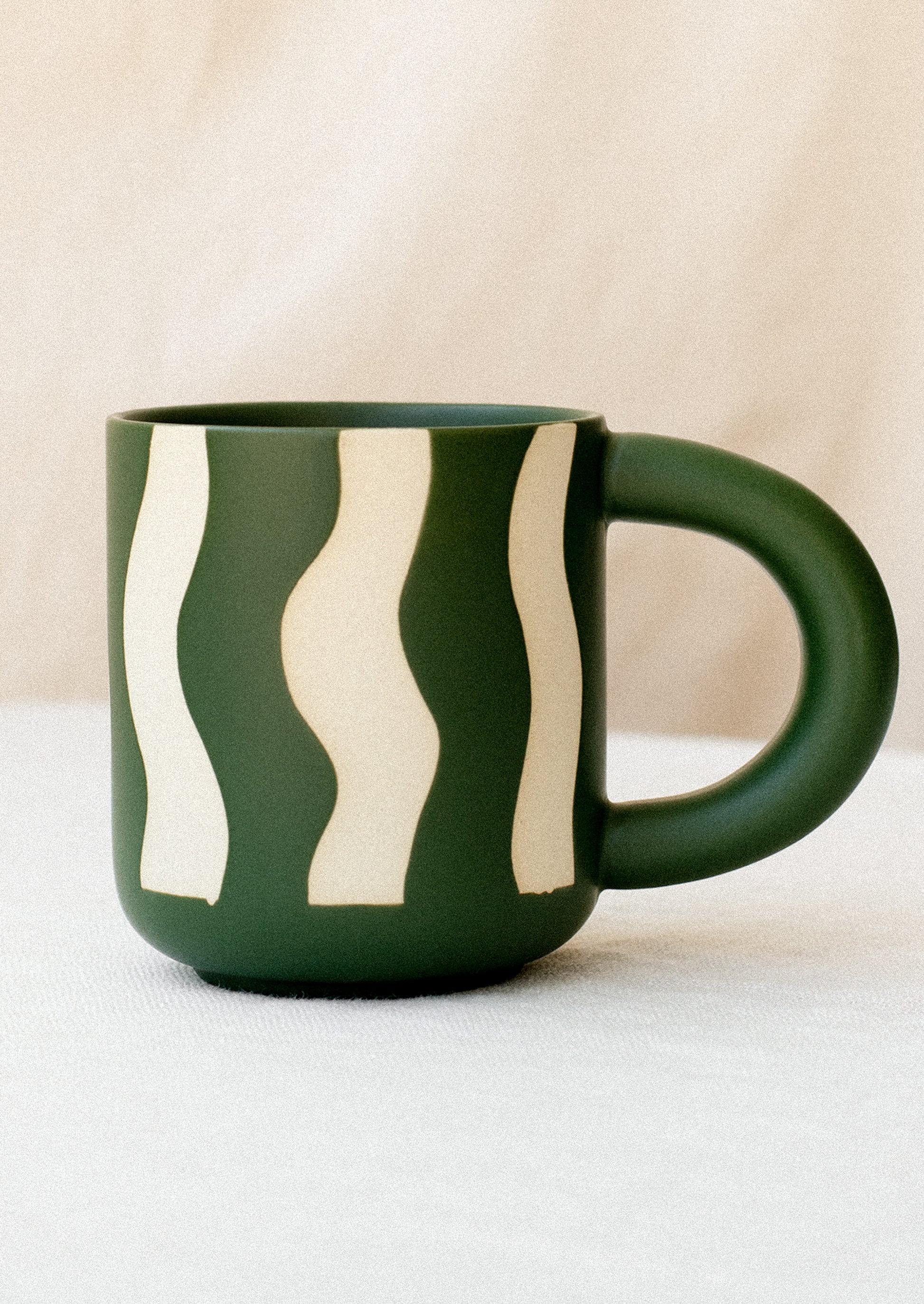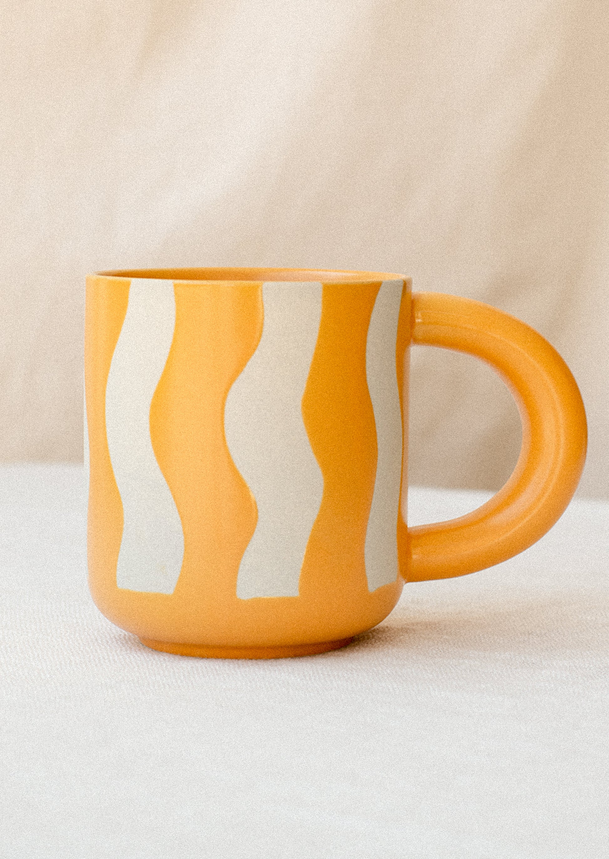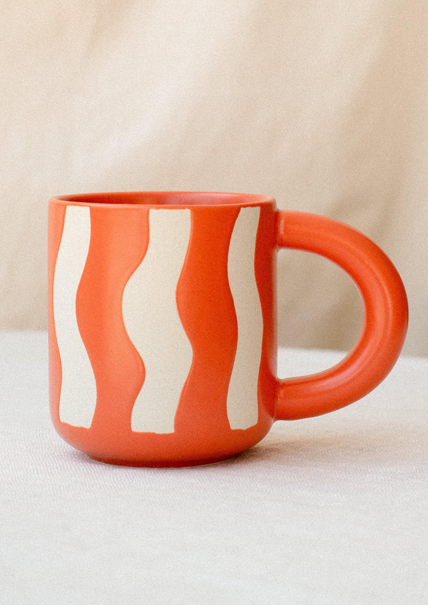 A wiggly wave pattern comes to life on this ceramic mug thanks to a wax relief technique, where raw clay peeks out from underneath a bright wash of color.