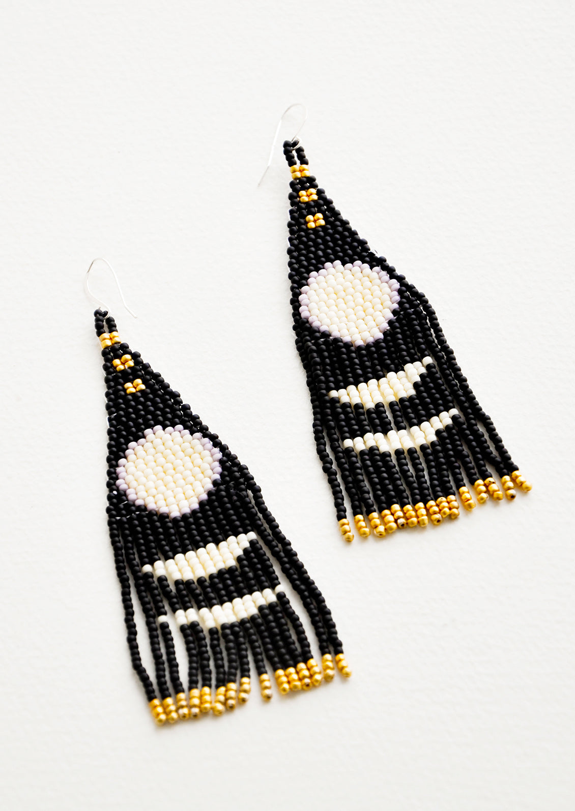 Fulls moons and waxing crescents take form in glass beads on these hand-beaded earrings from artist Shell Ji, showing off a mystical palette of black, ivory, gold and lavender.