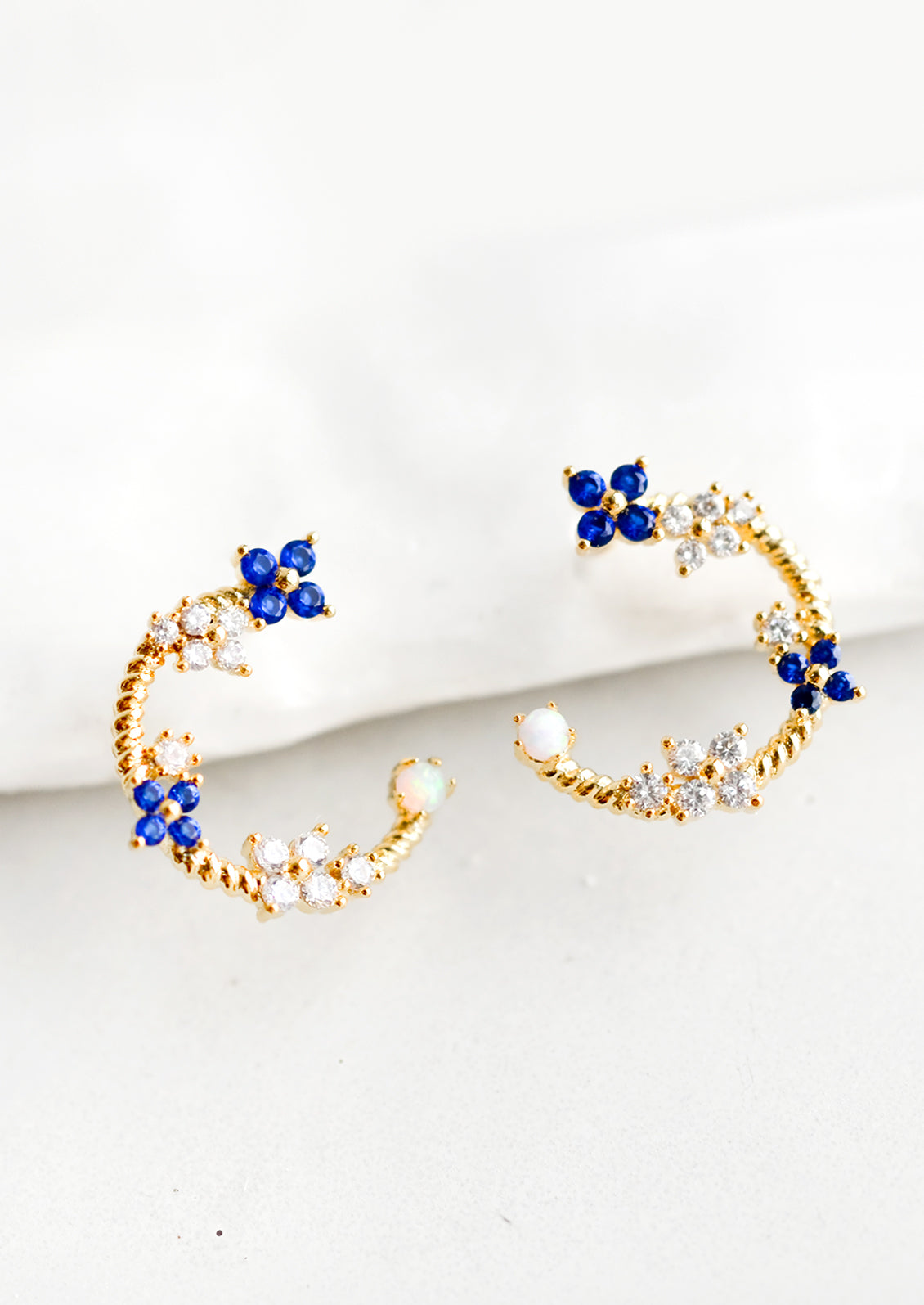 Bright blue blooms give vibrant color to these classy earrings (accented with prismatic opal), crafted in an easy to wear stud-meets-hoop silhouette.