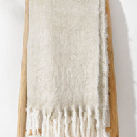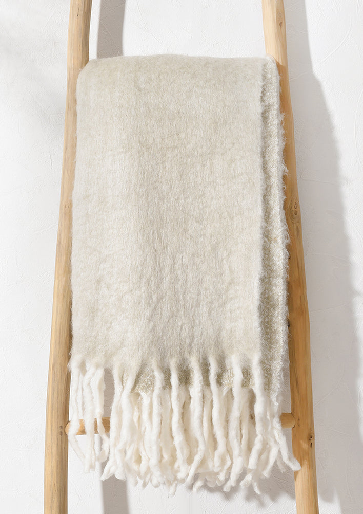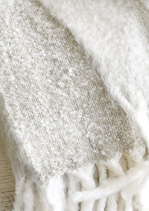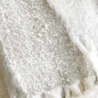 An impossibly soft, mohair-like knit steps in as an everyday indulgence—finished with tasseled trim and a mottled bouclé on the reverse side, showing off a gorgeous constellation of tan and ivory hues.