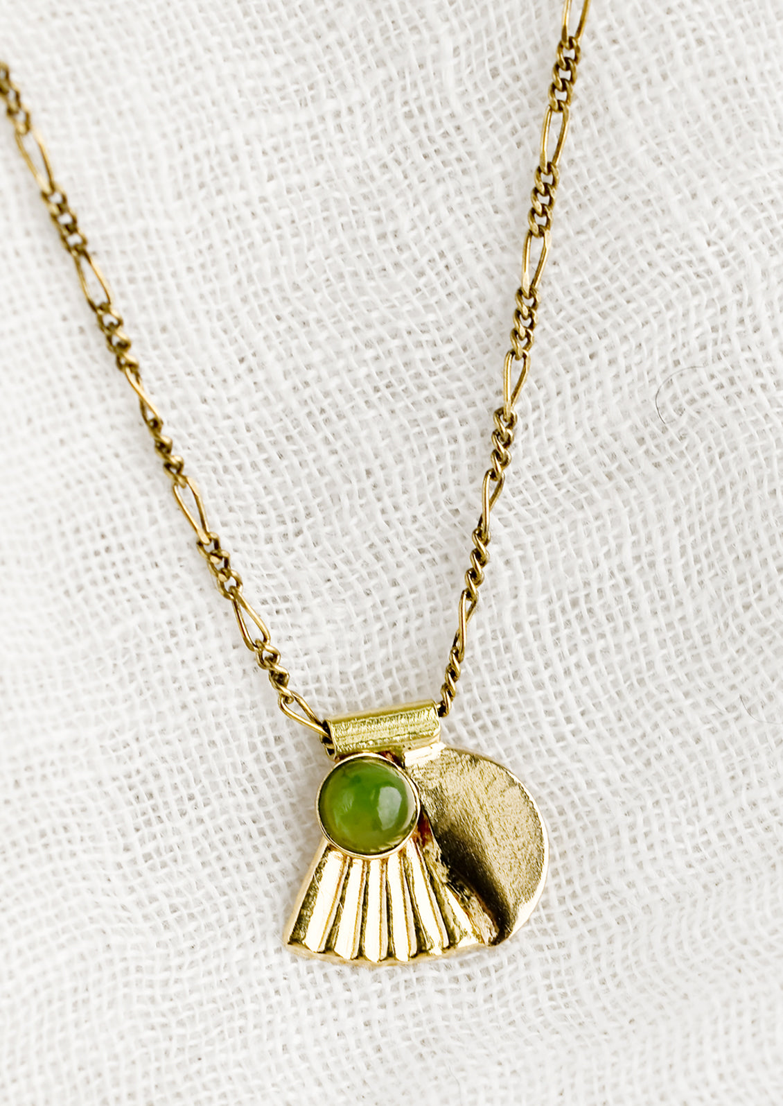 An art-deco inspired design is accentuated with a glowing jade cabochon and strung on an antiqued brass figaro chain on this timeless necklace, inspired by the glamour of the past.