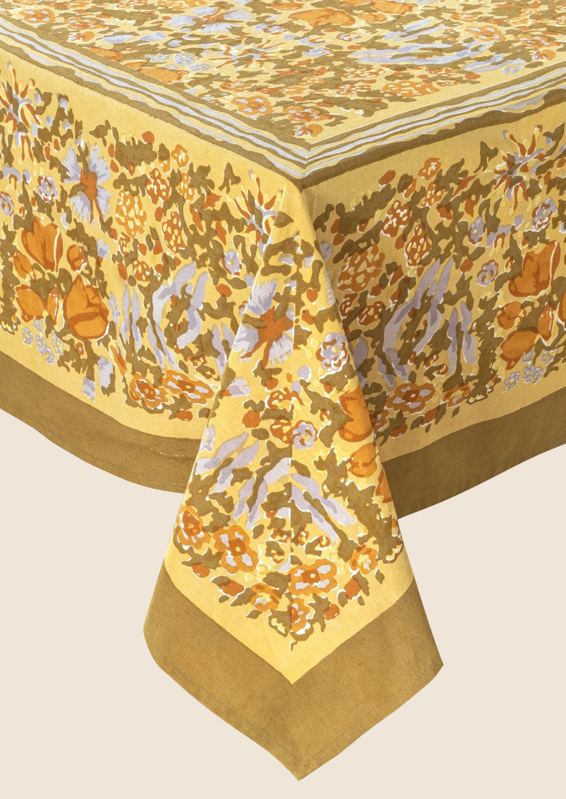 Verdant and lush, this bountifully printed tablecloth is inspired by the luxuriant, loosely tended gardens of Southern France. The vibrant watercolors of this French linen will enliven any room or outdoor table in spring, summer, and beyond.