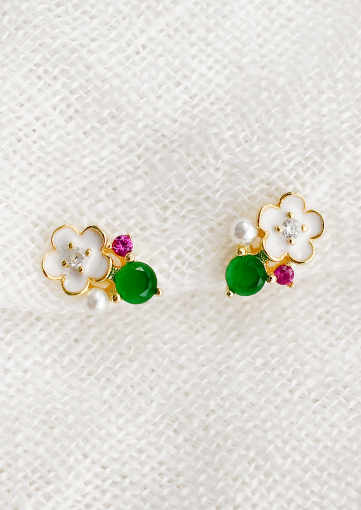 Flowers bloom in glossy white enamel on these petite stud earrings, dressed up with a tiny pearl and green and pink crystals.