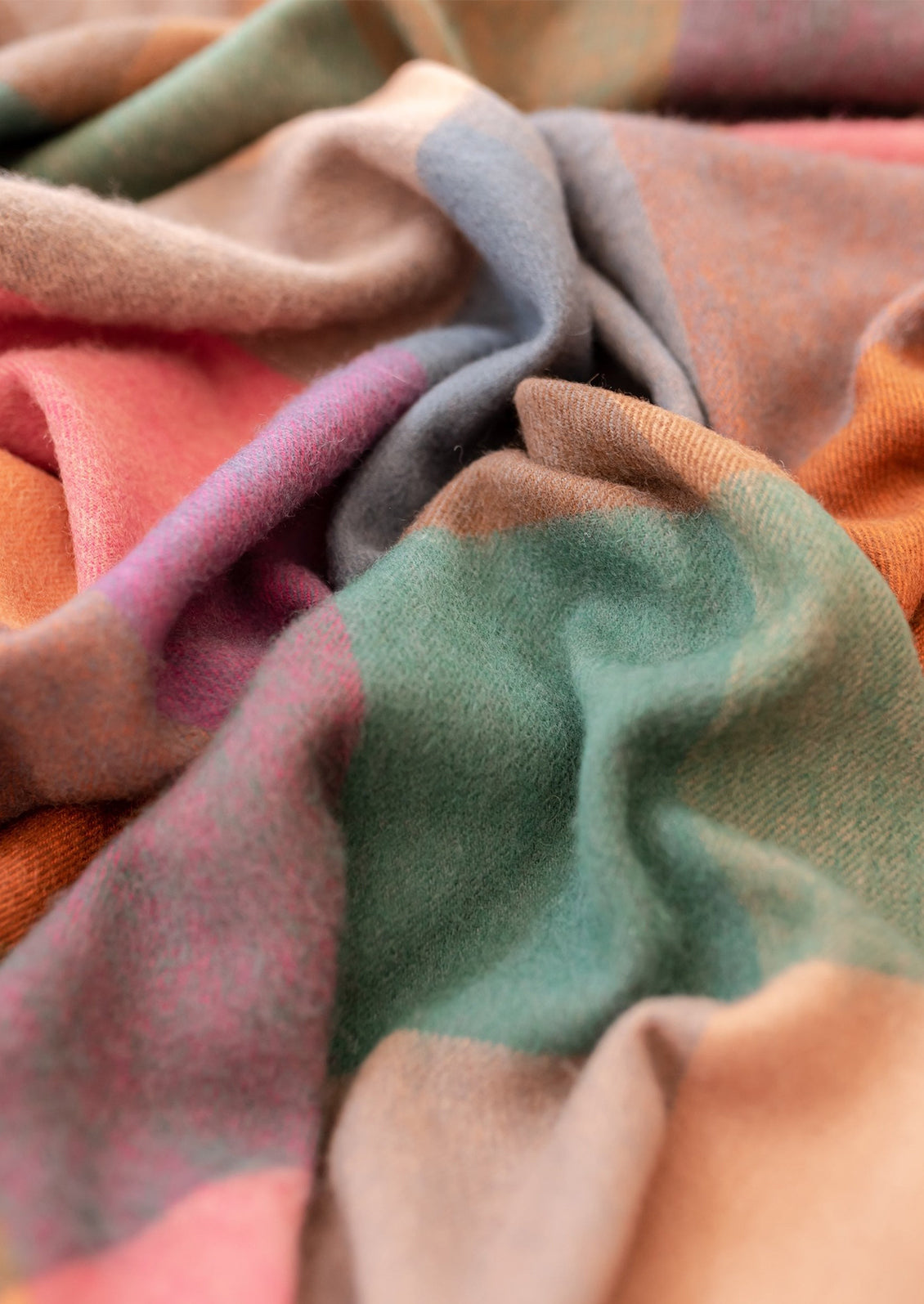 Featuring a joyful mix of in a modern check design, this cozy and colorful blanket is made from pure lambswool sourced from Inner Mongolia. The unique yarn texture of the individual lambswool strands creates air pockets that retain heat while repelling moisture, keeping you warm when you’re cool and cool when you’re warm. Along with being a naturally insulating, breathable and hypoallergenic textile, it’s beautifully soft.