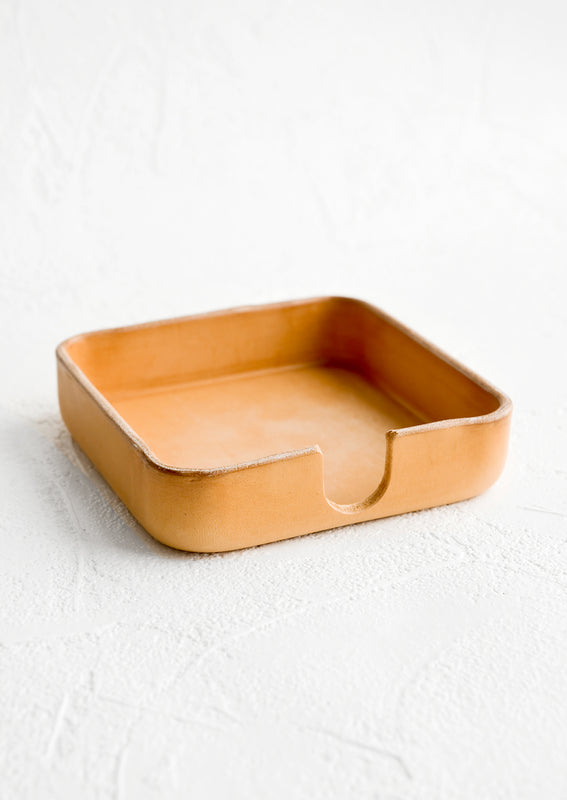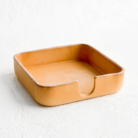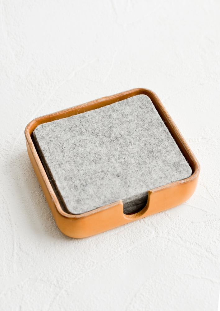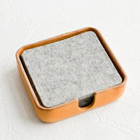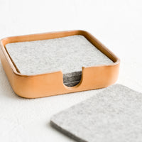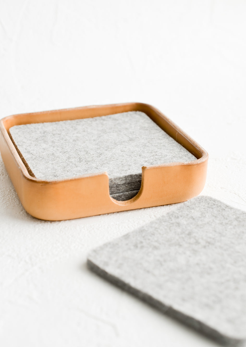 Designed for Graf Lantz' merino wool coasters, this natural leather coaster holder offers a perfect fit and convenient storage for a set of four square coasters. The raw, unfinished leather will develop a natural patina over time.