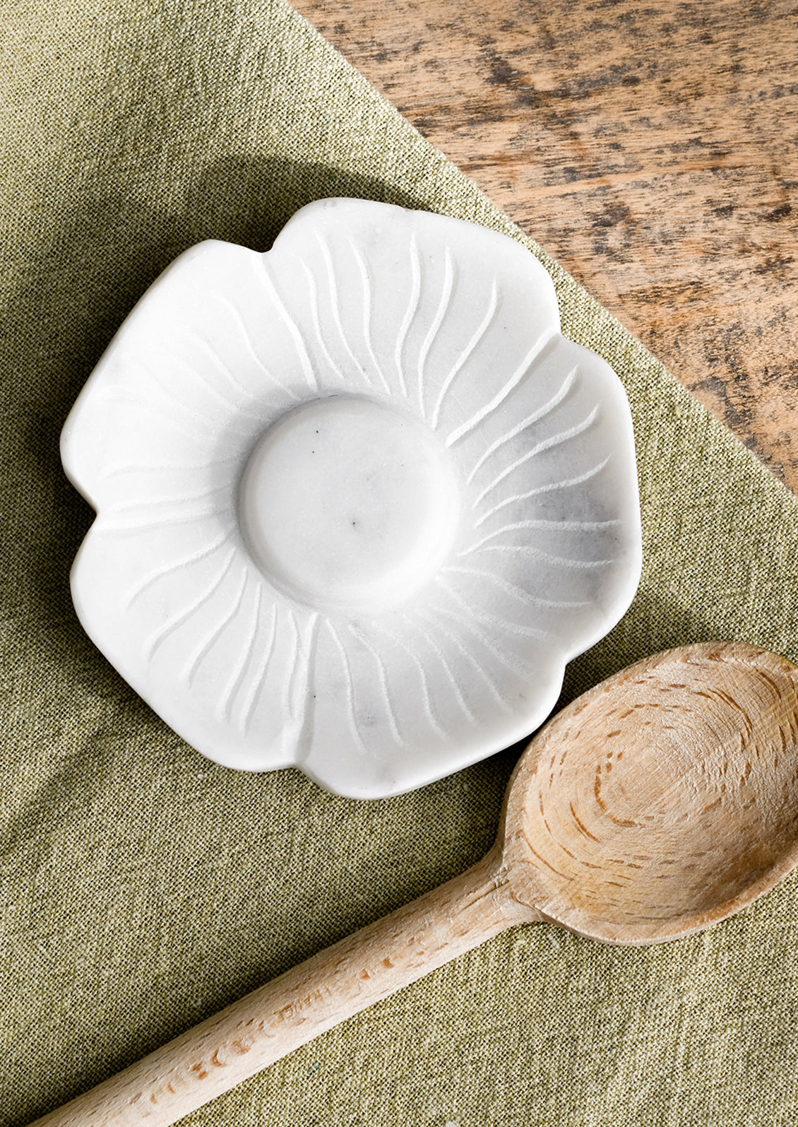 In solid white marble, this flower-shaped spoon rest is a beaut in the kitchen, but can also double as a trinket dish for jewelry.