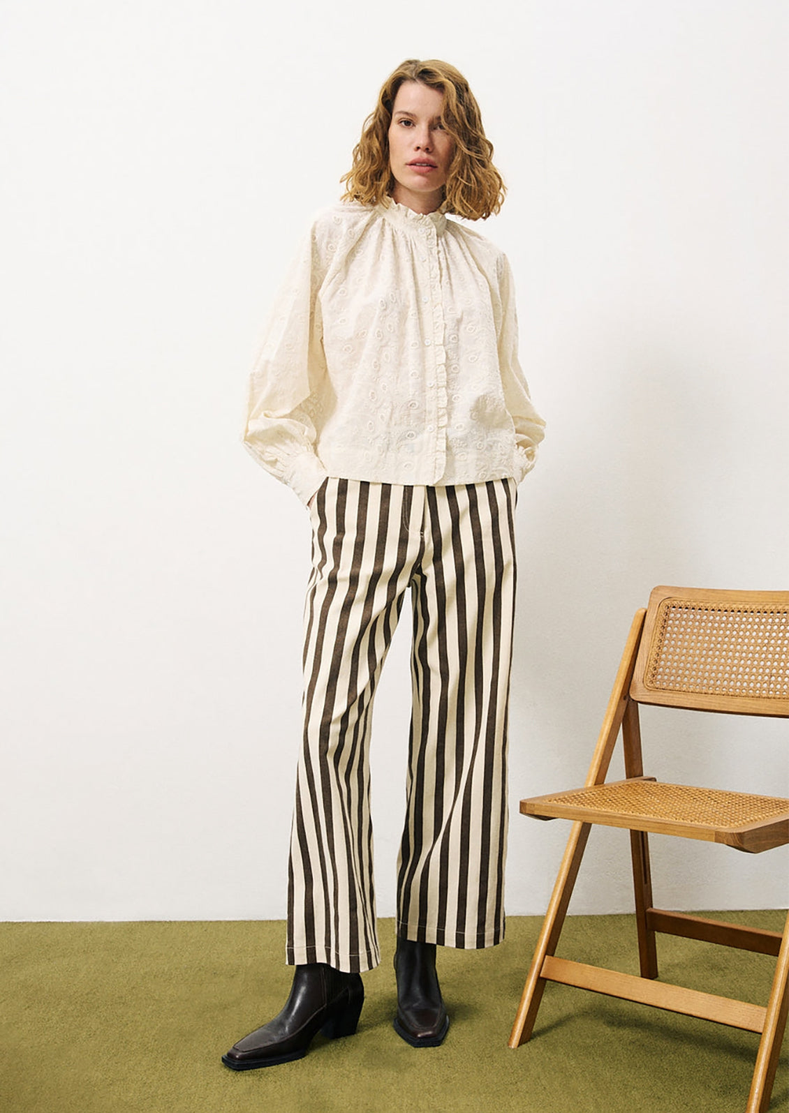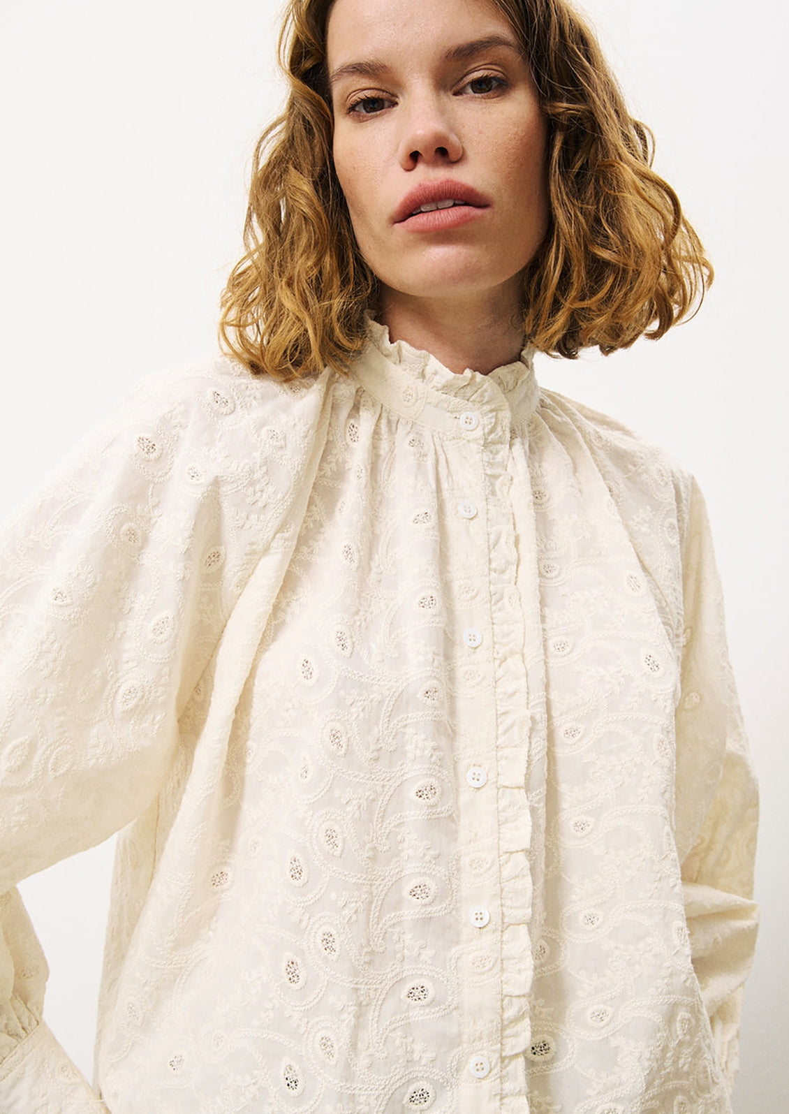 | Details | Button front blouse with ruffle trim and embroidered design |