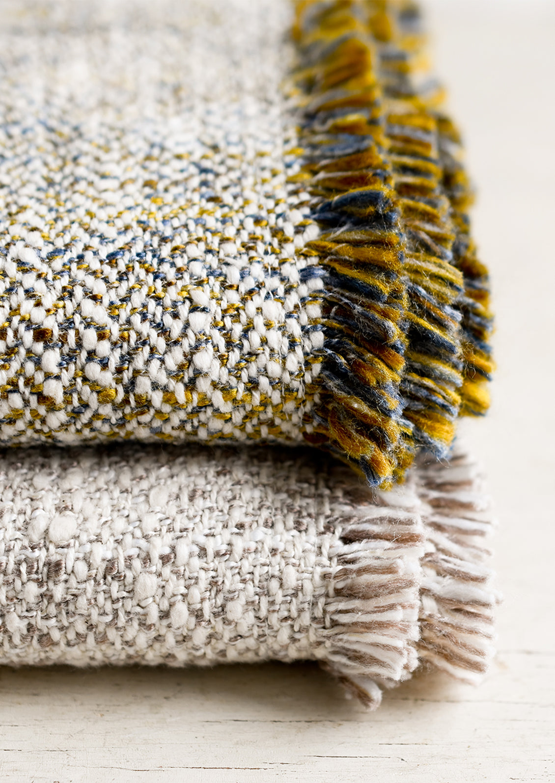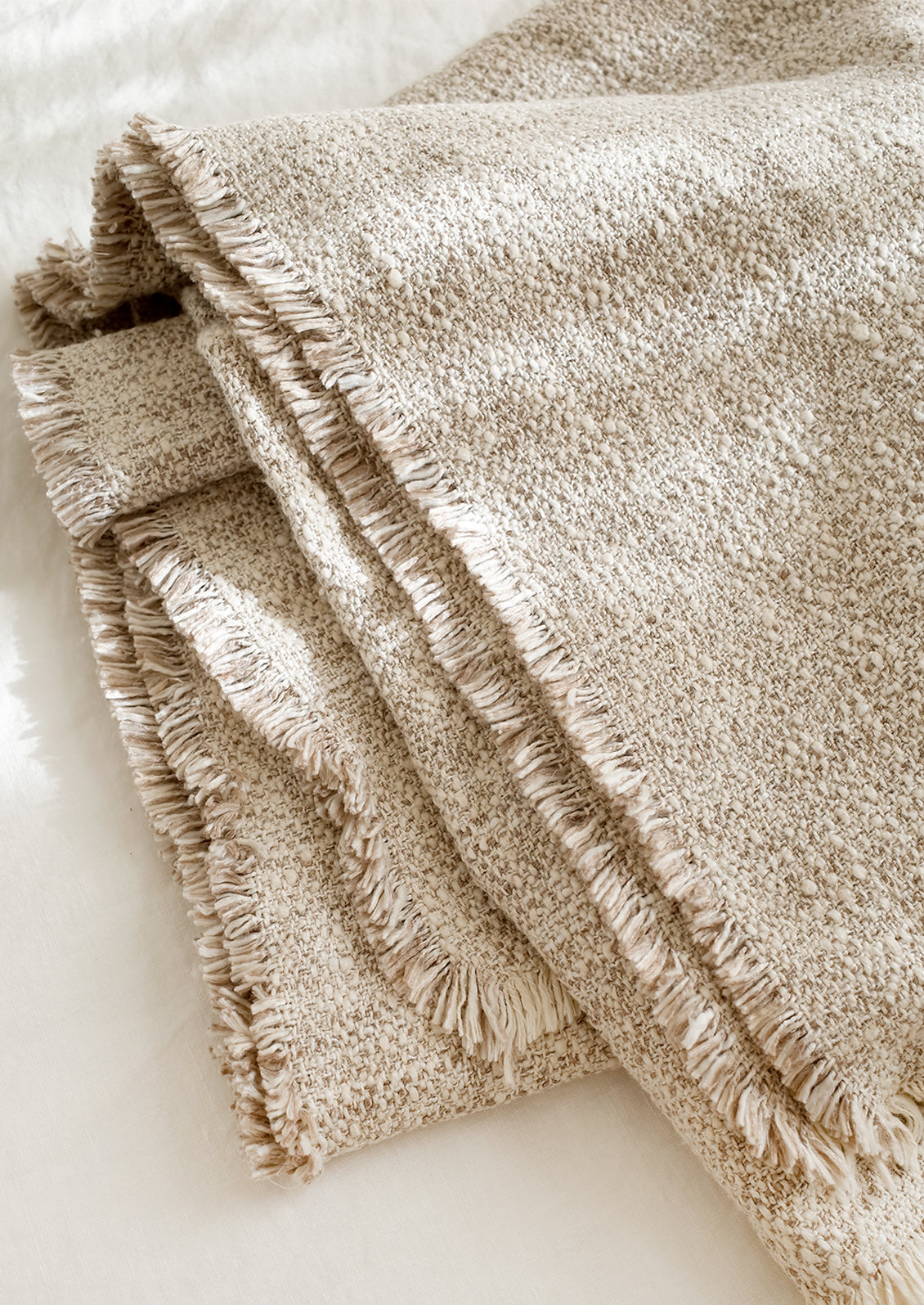 In a machine washable cotton blend, this versatile throw shows off a textured, boucle-like hand and a two-tone fringe trim.