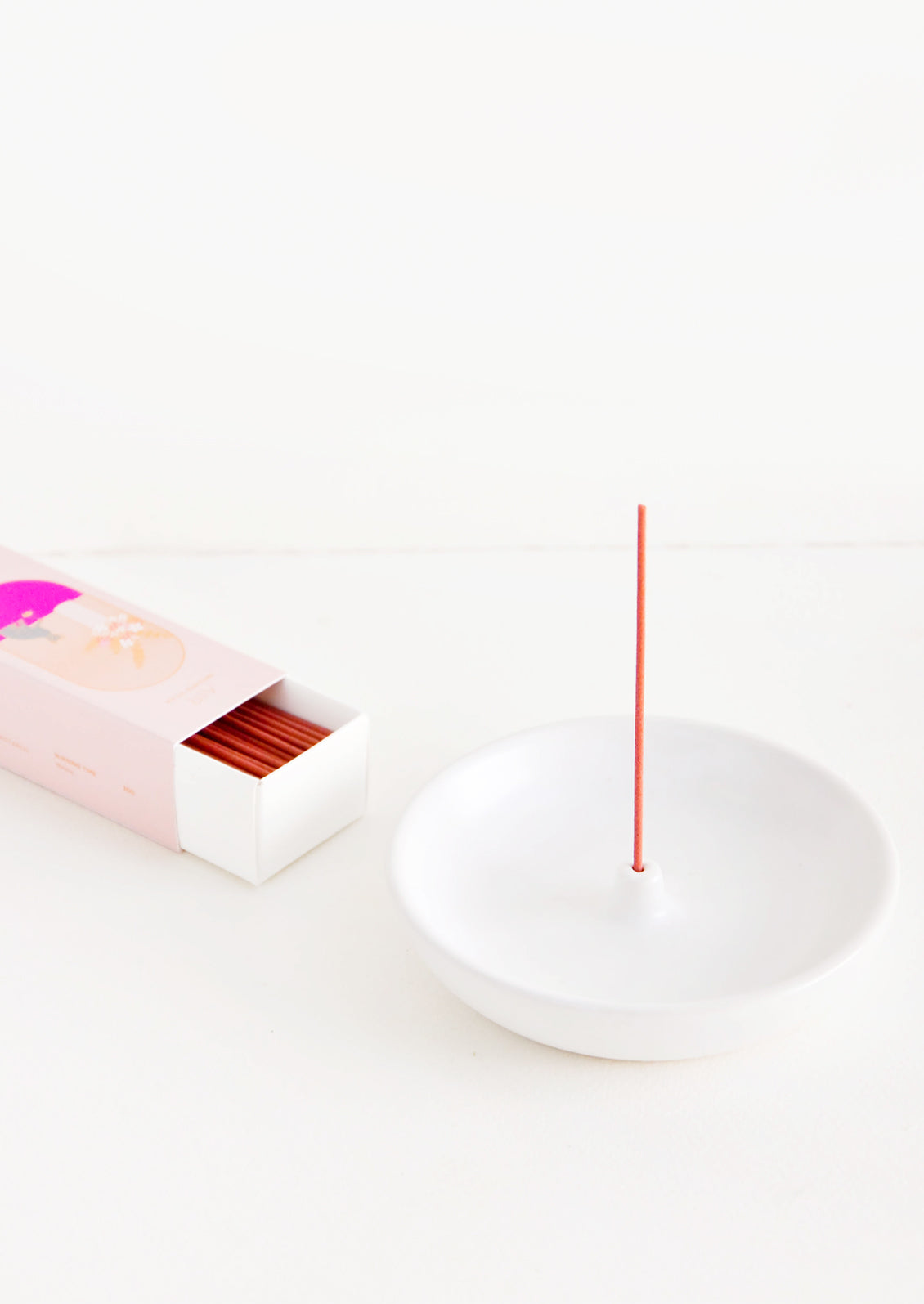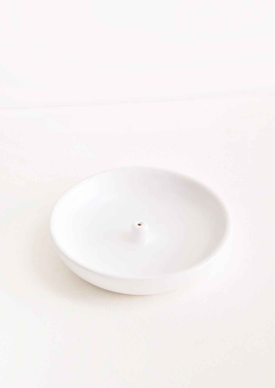 In smooth white ceramic, this incense holder is striking in its simplicity. A sizable circumference ensures that all ashes land inside the dish (functional and pretty).