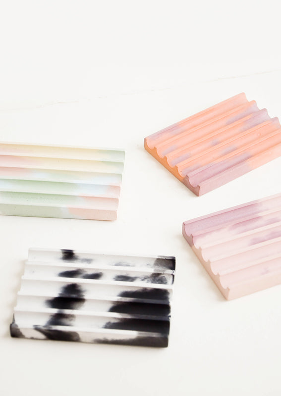 Made using recycled materials, this soap dish is 30% lighter than traditional concrete—each one shows off a unique marbled pattern. Its ridged construction allows for some drainage, ensuring it won't become a soapy, slippery mess.