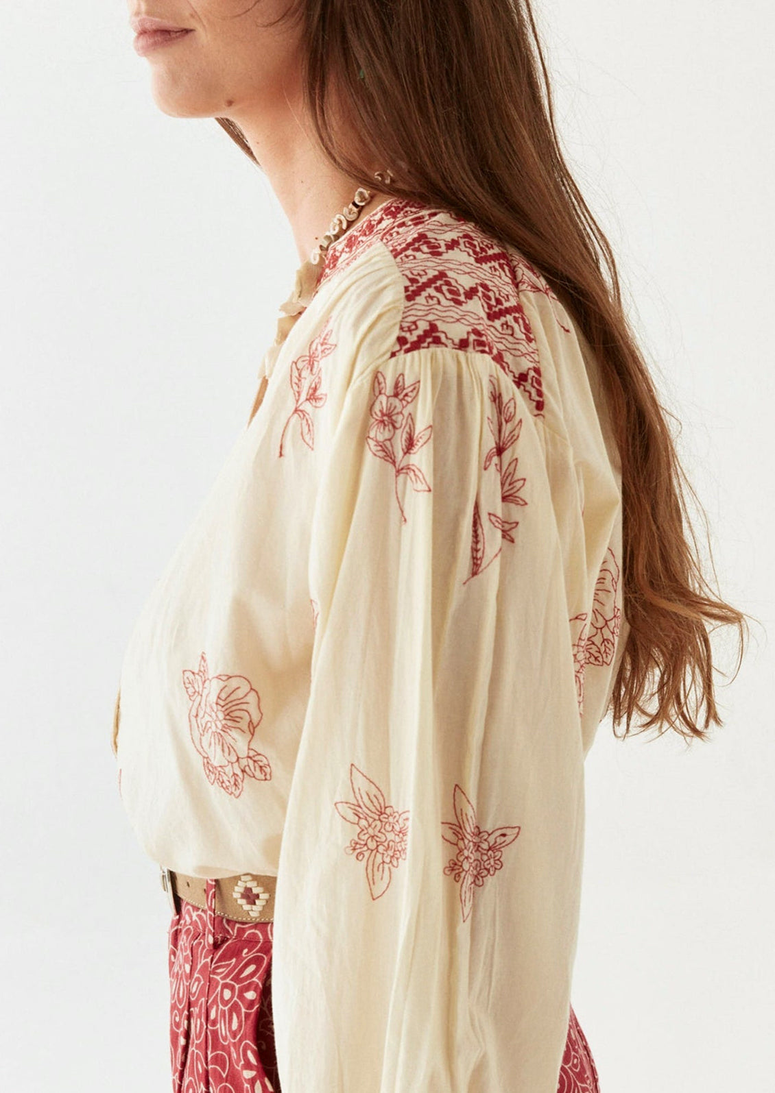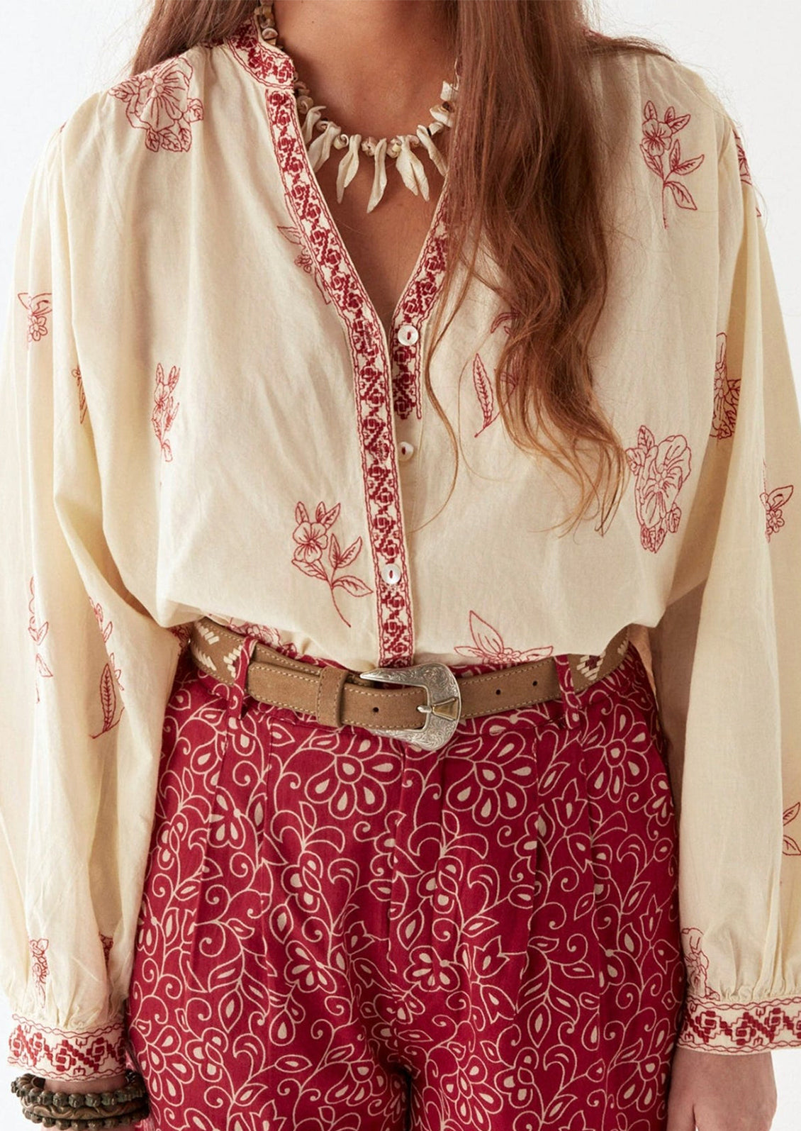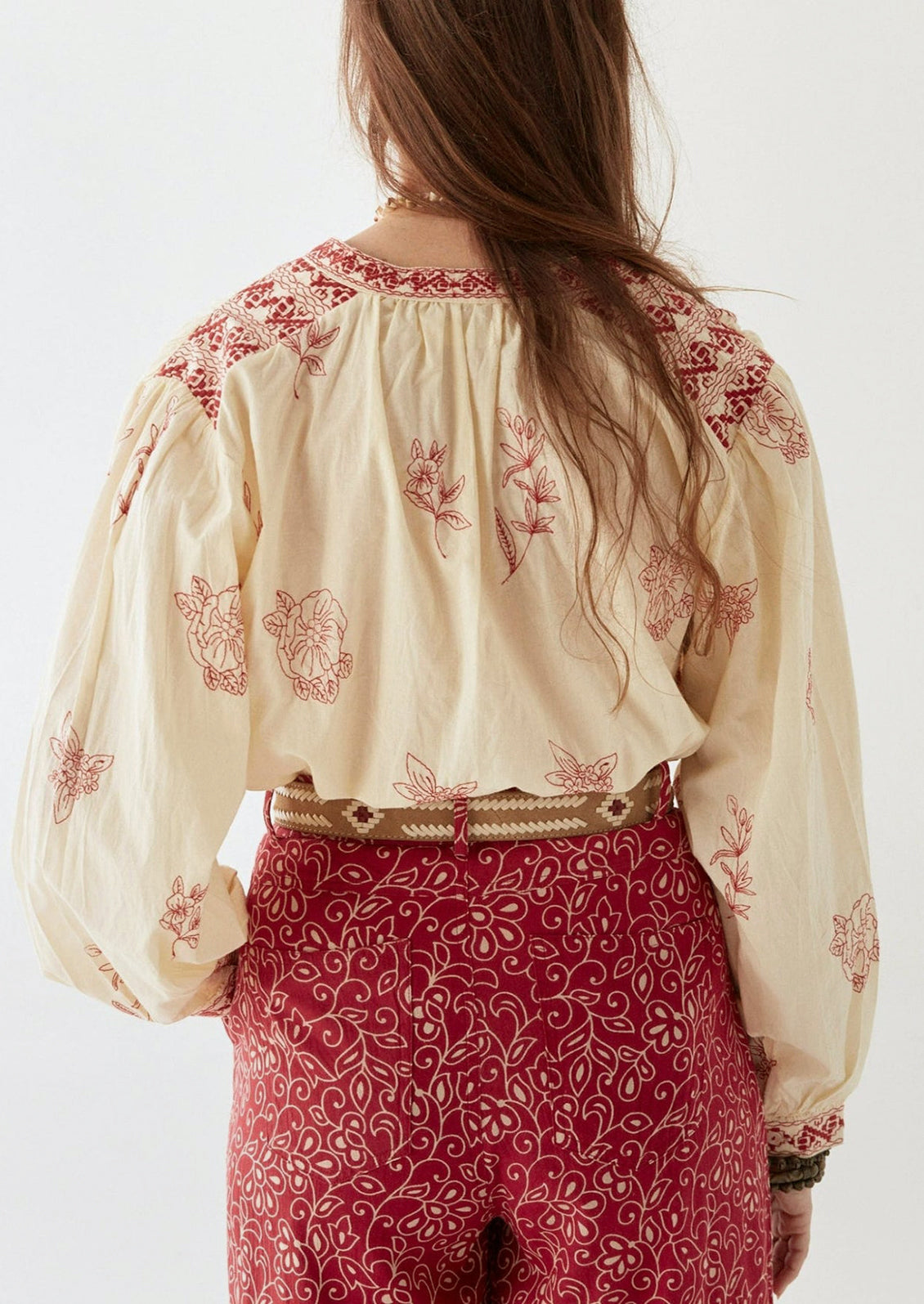 A delicate balance of craftsmanship and wearability, Maison Hotel's Margaux blouse is a testament to traditional techniques, reimagined for the modern woman. Crafted from airy cotton, its intricate embroidery is applied using time-honored methods, creating a rich interplay of texture and pattern.