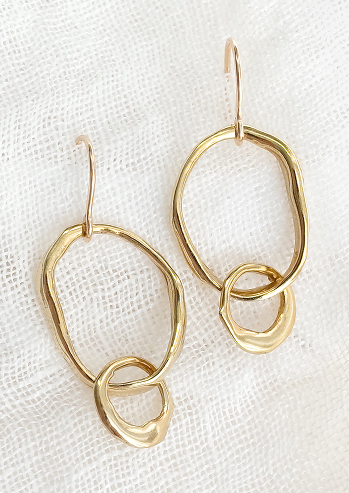 Hand carved in wax to create an amorphous and organic shape, these effortless earrings are constructed in gilded brass with a fluid look.