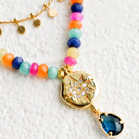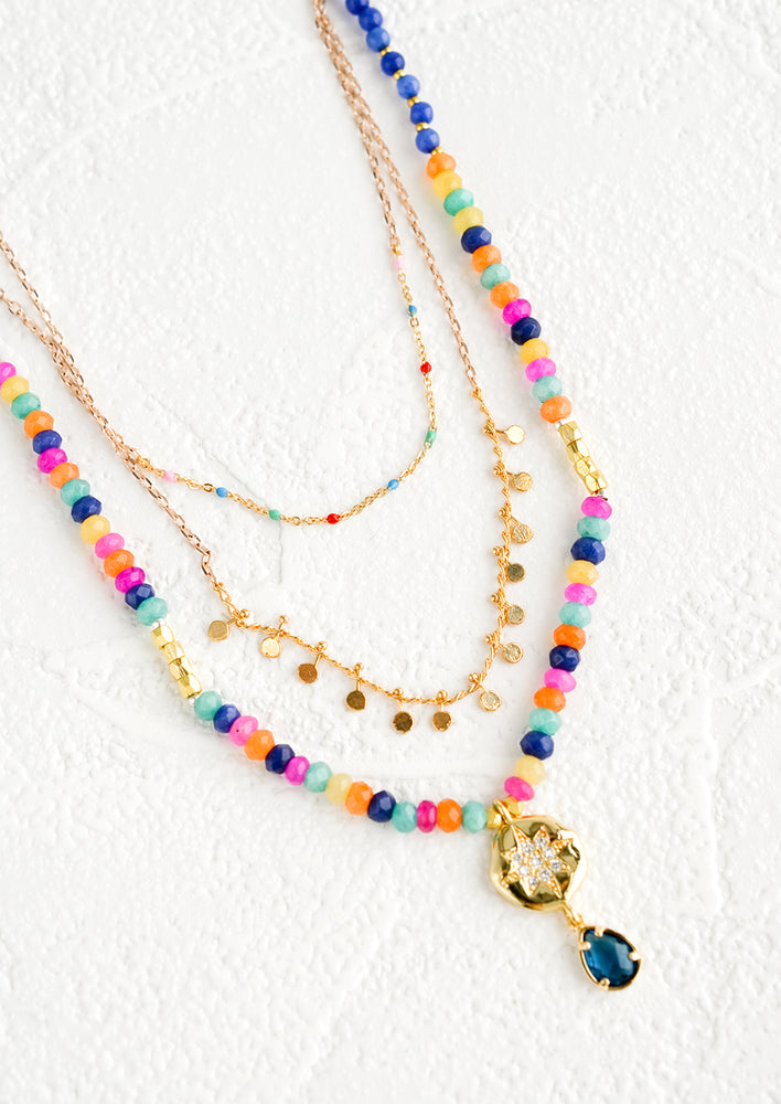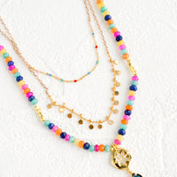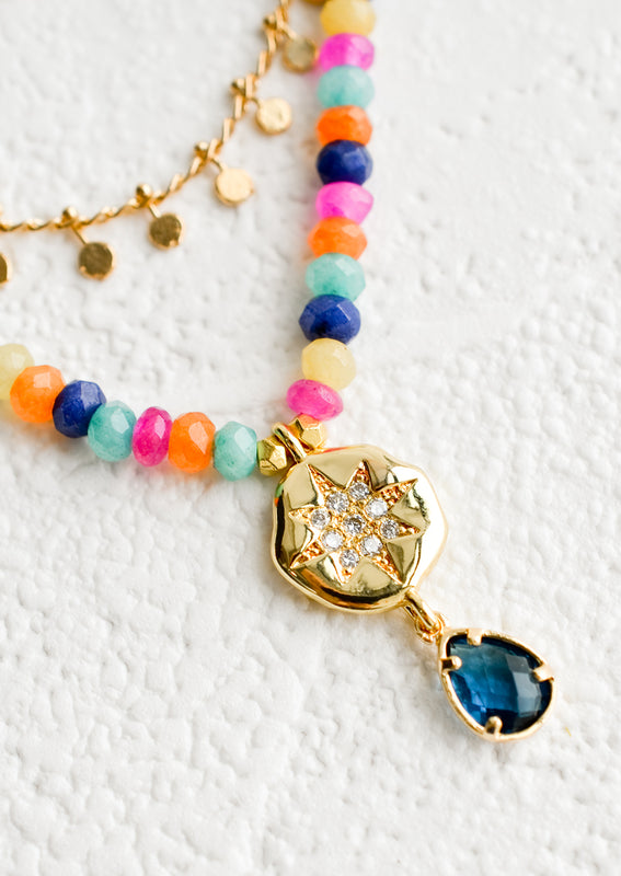 Brightly bedecked with multicolor beads and a glistening, starry charm, this necklace shows off dainty inner layers of gilded gold strands.