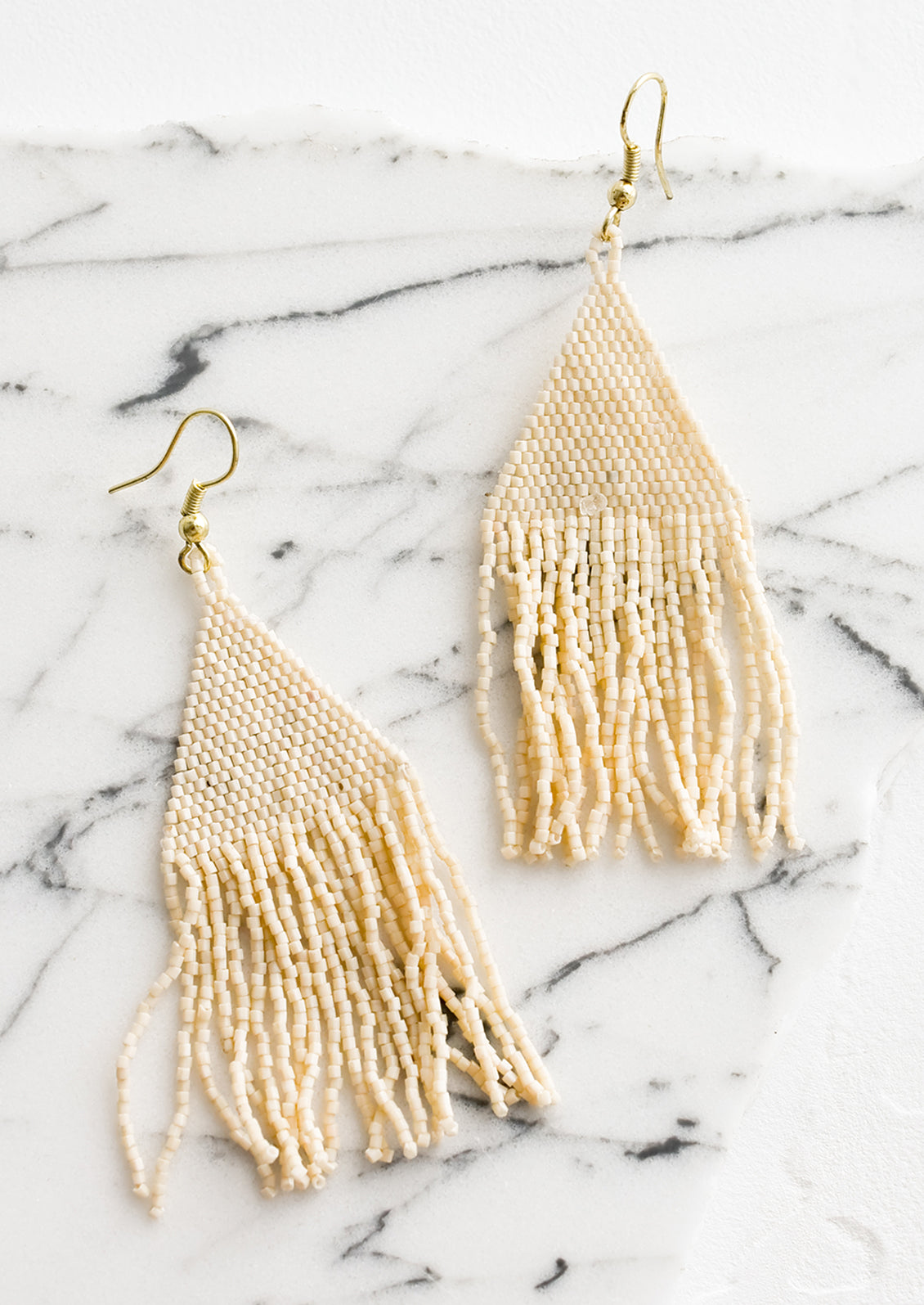 Glass seed beads with a subtle metallic finish give festive flair to these fringed earrings, showing off sparkling strands with every turn.