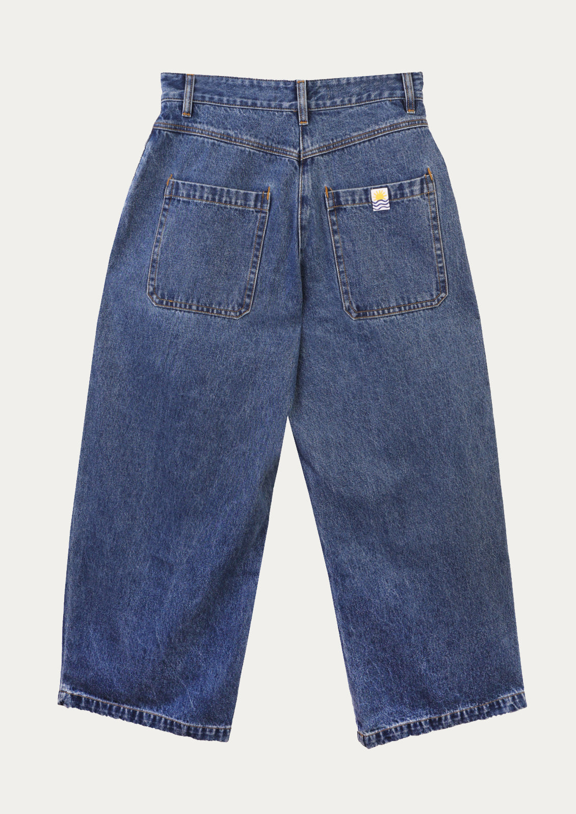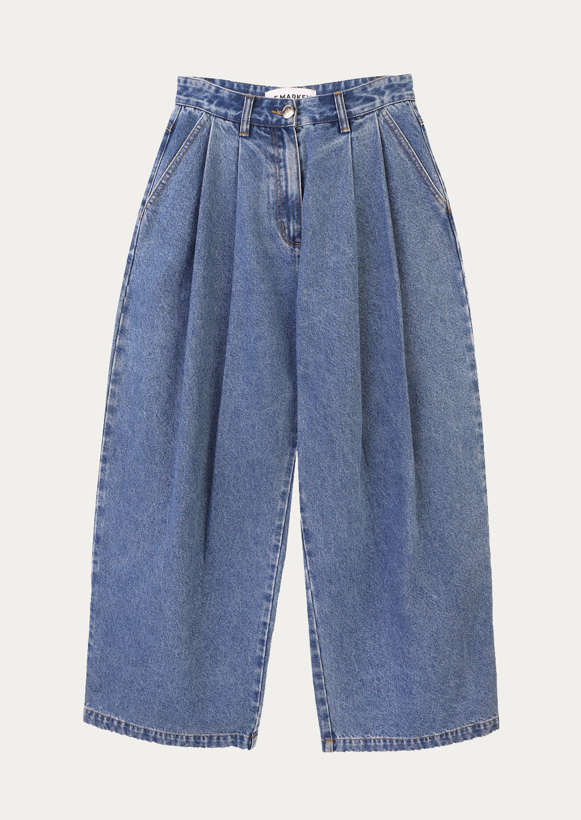 High-waisted pleat front jeans in robust, heavyweight mid-blue denim. Features utility pocket detailing and contrast ochre topstitching. From L.F. Markey.