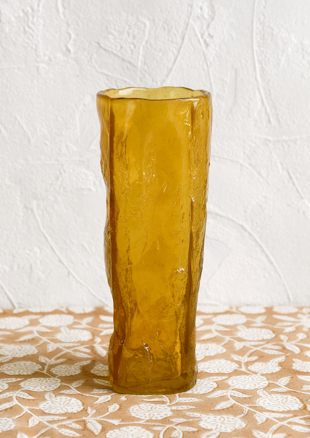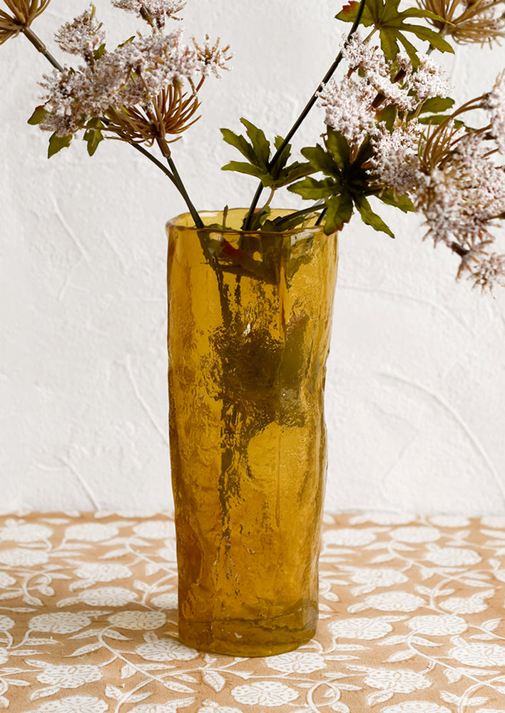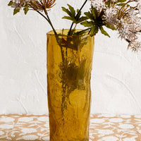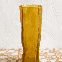 In an asymmetrical shape and a texture resembling cast resin, this amber-hued glass vase shows off a slim silhouette and unique appearance.