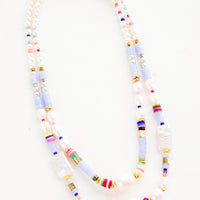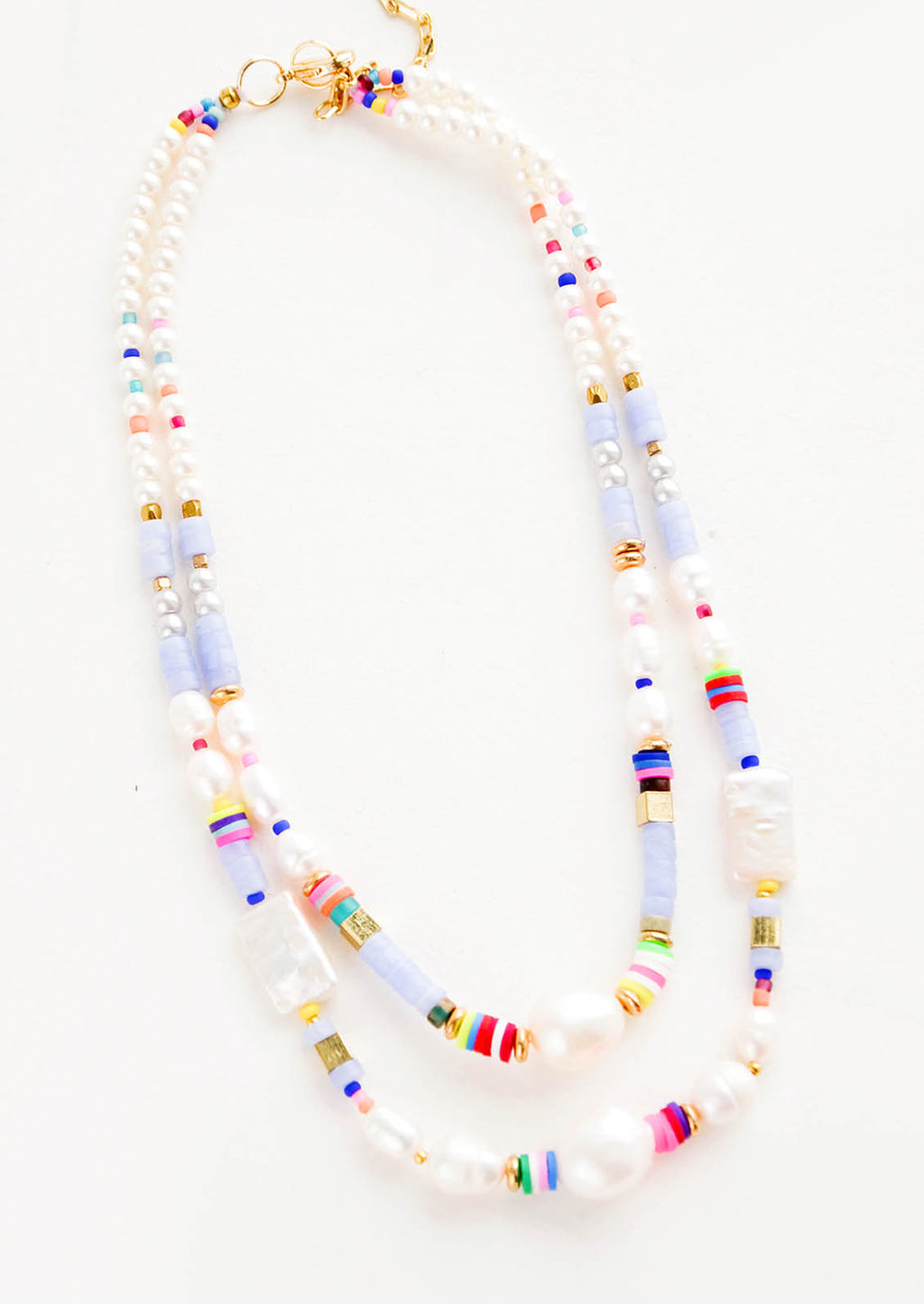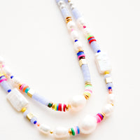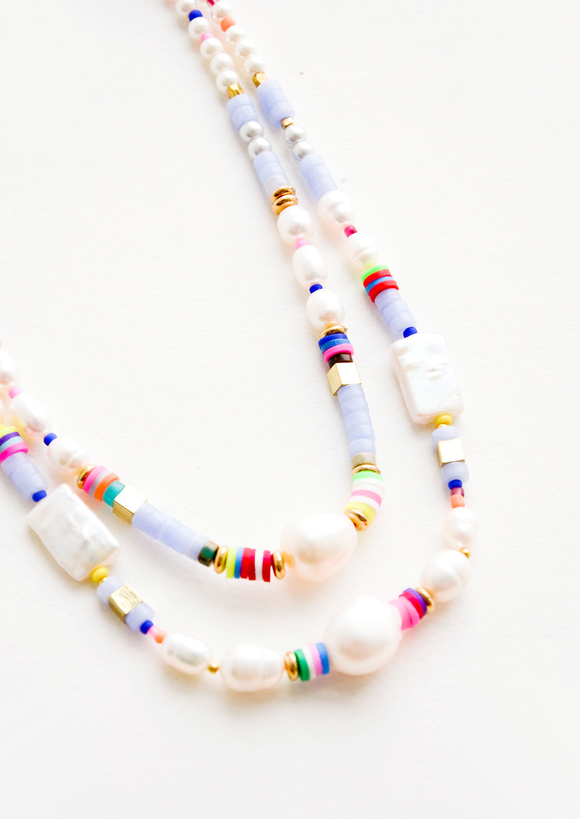 A mix of pearls in smooth, square and irregular shapes gives a youthfully quirky feel to this beaded necklace, dotted with colorful heishi and seed beads throughout.
