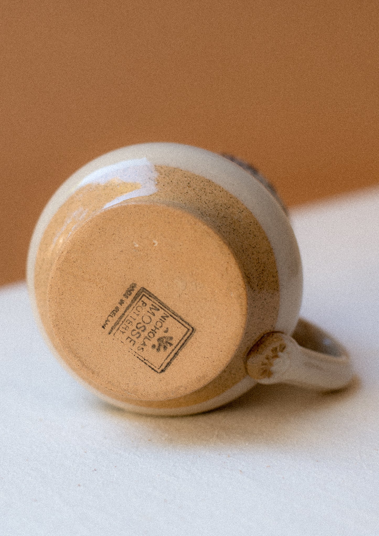 Ceramic. 3.75" x 3.25" at widest diameter. Comfortably holds 10 oz.
