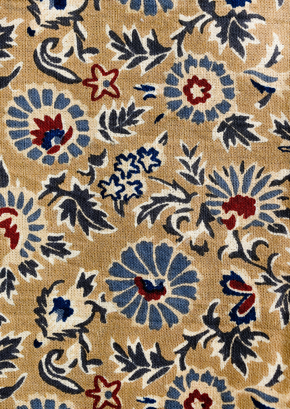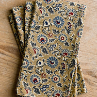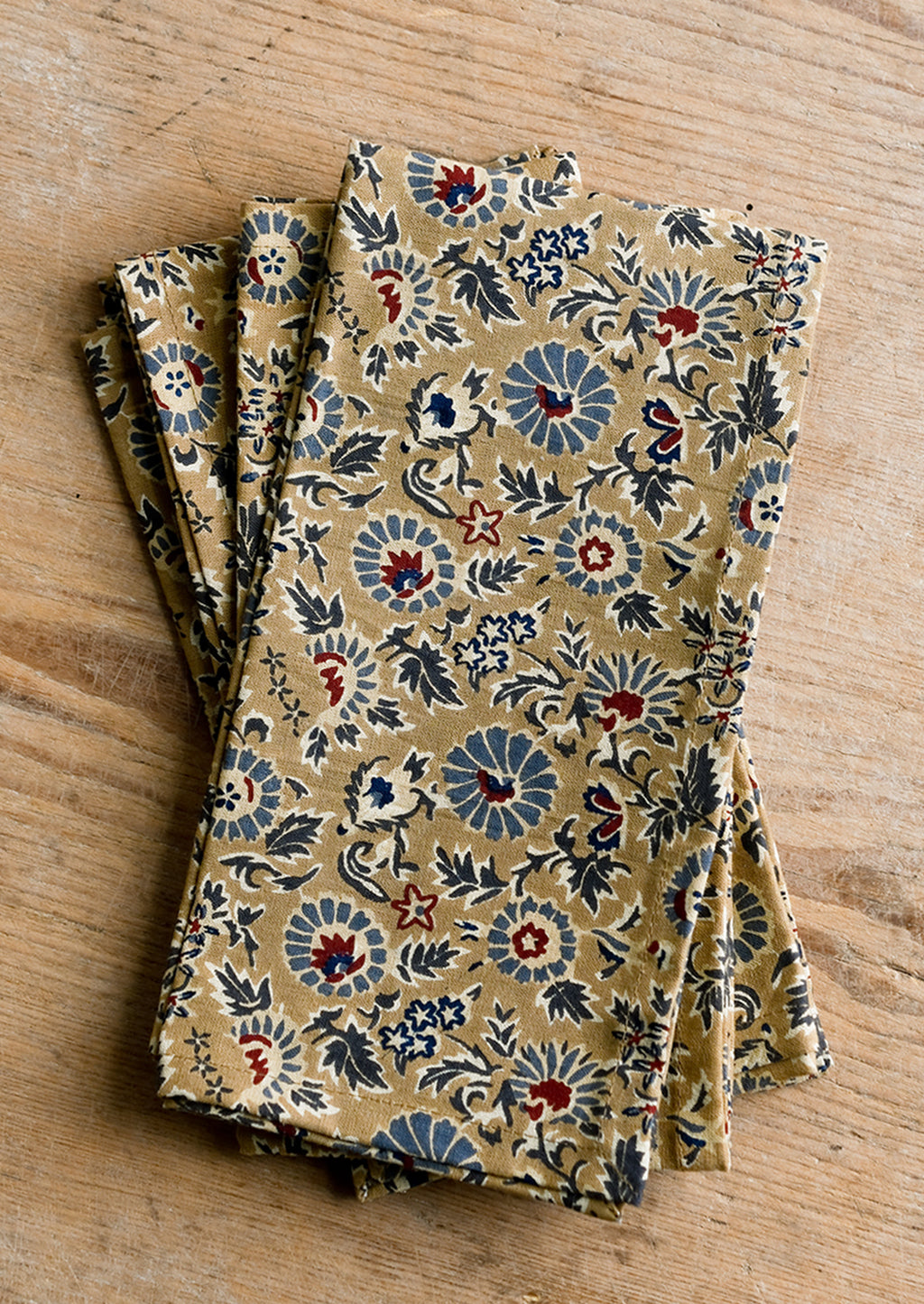 In caramel-colored cotton, this set of dinner napkins (sold as a set of four) shows off a playful floral motif in indigo and crimson.