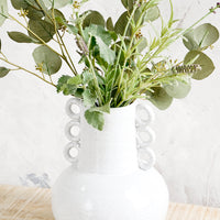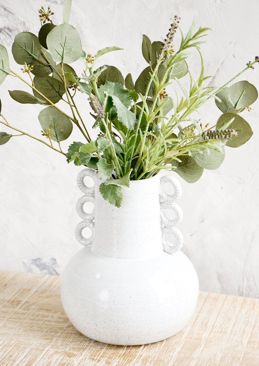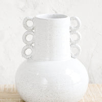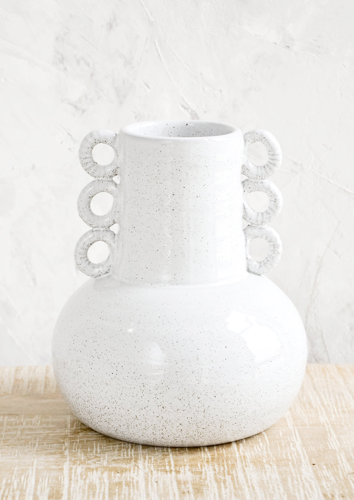Showing off softly speckled curves, this large ceramic vase flaunts quirky details. A wide belly shape narrows to a sleek spout, decorated with loopy handles.