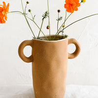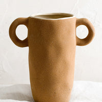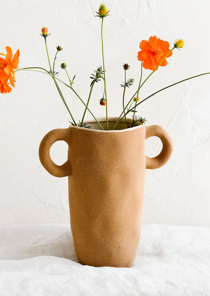 Showing off a trophy-like shape, this stately vase was designed to be on display —  rendered in a raw, sandy-textured ceramic with a glossy glazed interior.