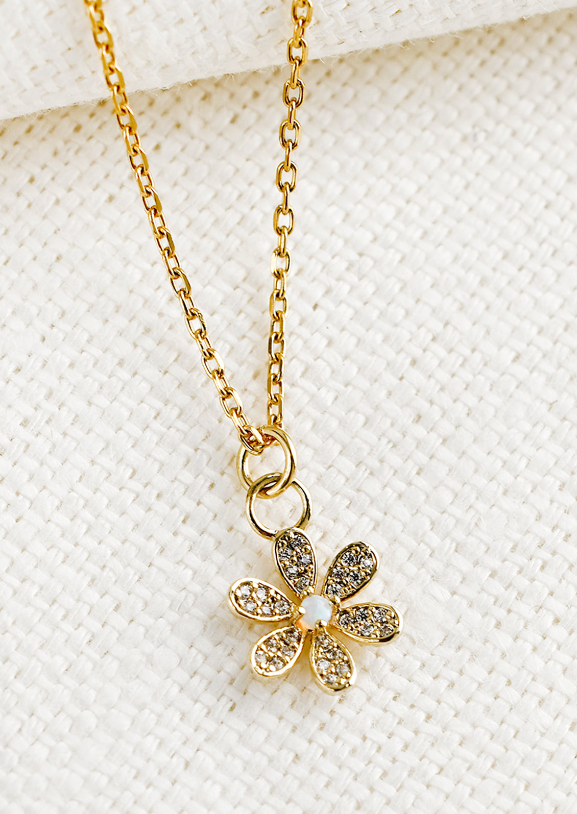 Sparkling crystal petals stem from a prismatic opal center on this golden necklace for everyday wear.