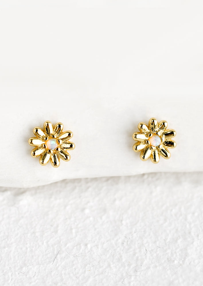 Prismatic opal stones rest within a golden daisy, crafted in recycled brass with a gilded 24k gold coating.
