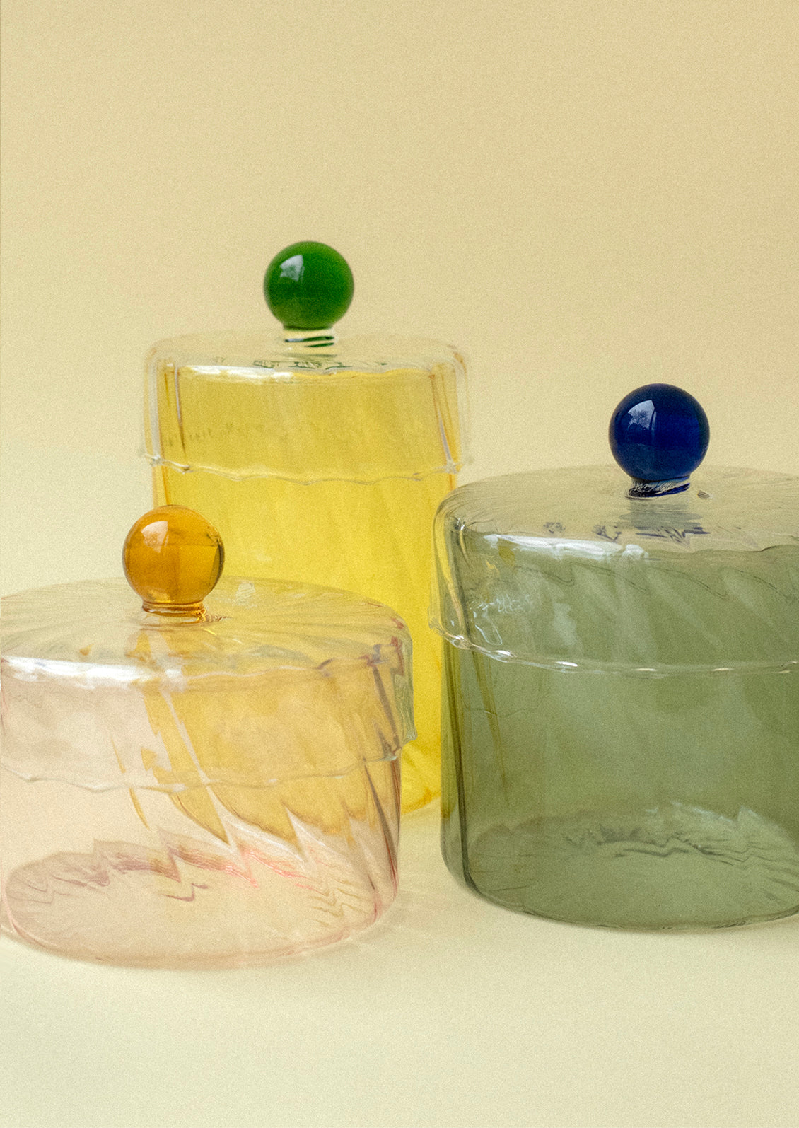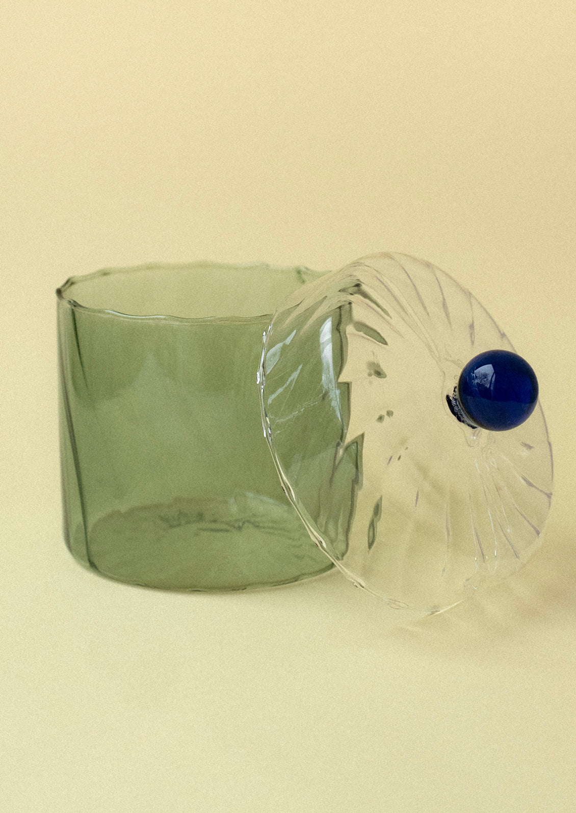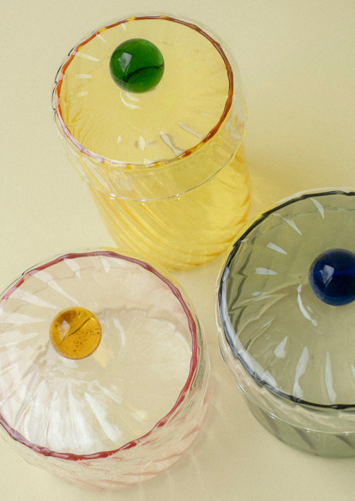 Showing off wavy, swirl textured glass, this colorful glass jar (with a tinted body and clear lid decorated with a colorful bauble-shaped knob) is perfect for candy, cotton balls, jewelry and more.
