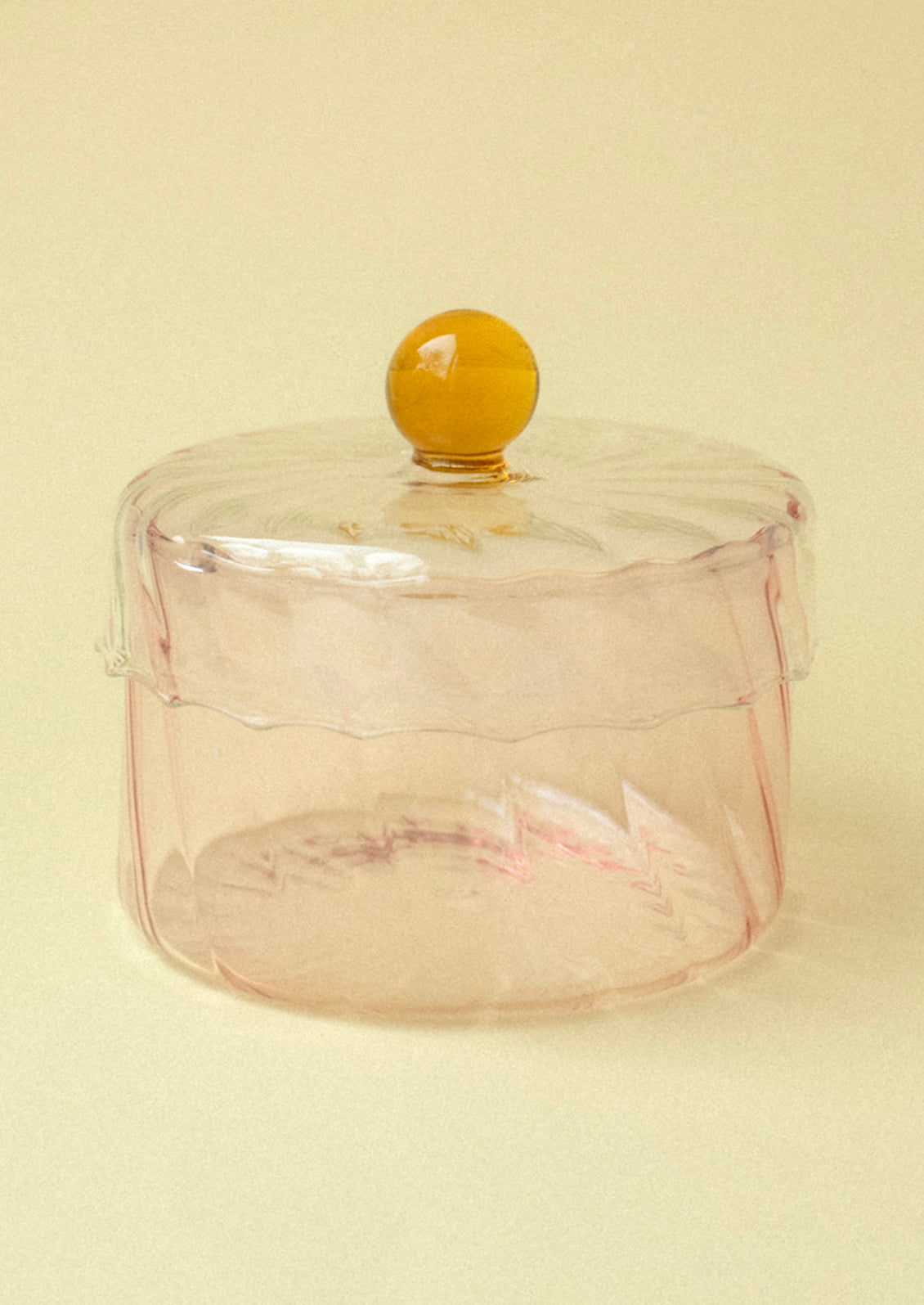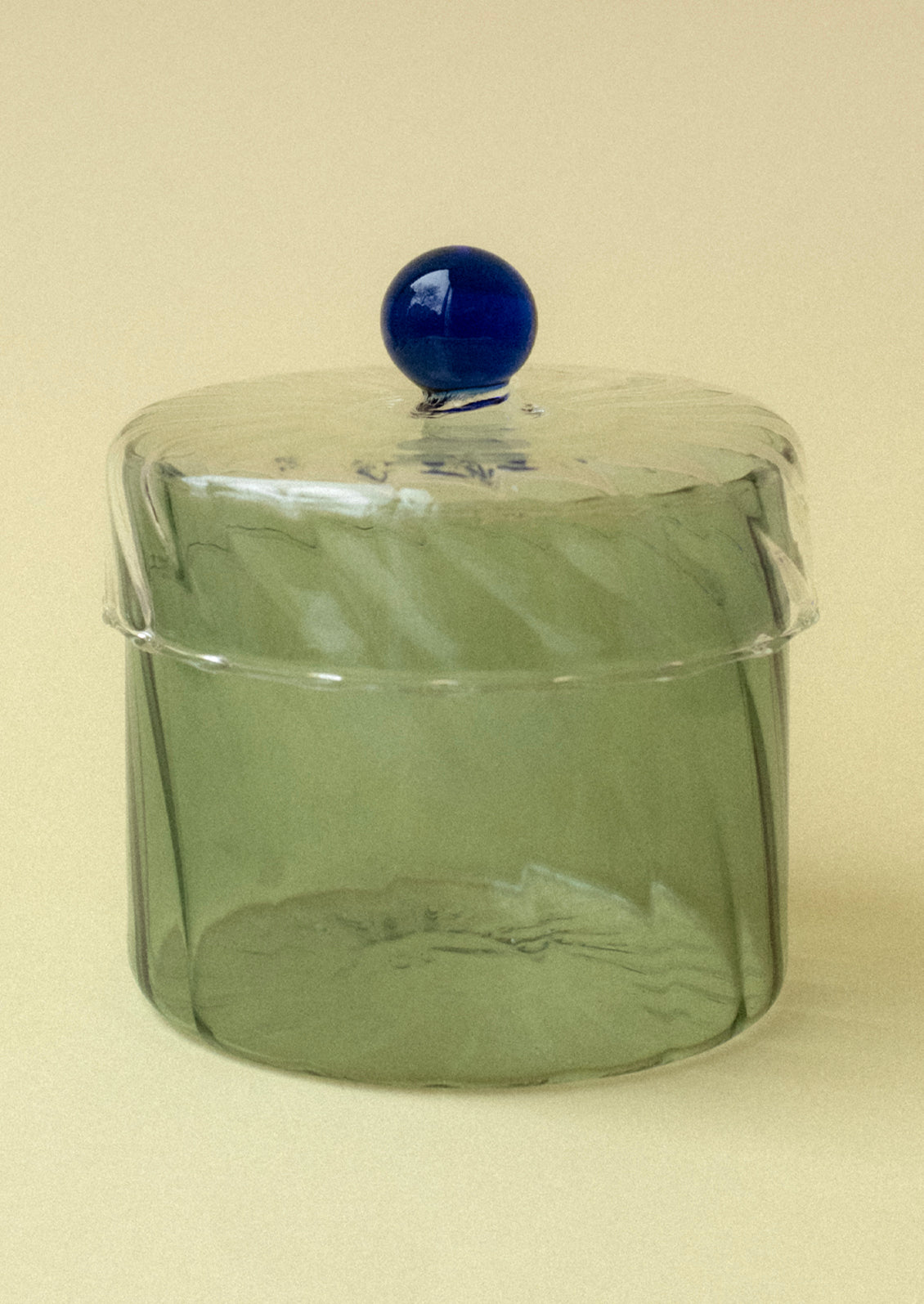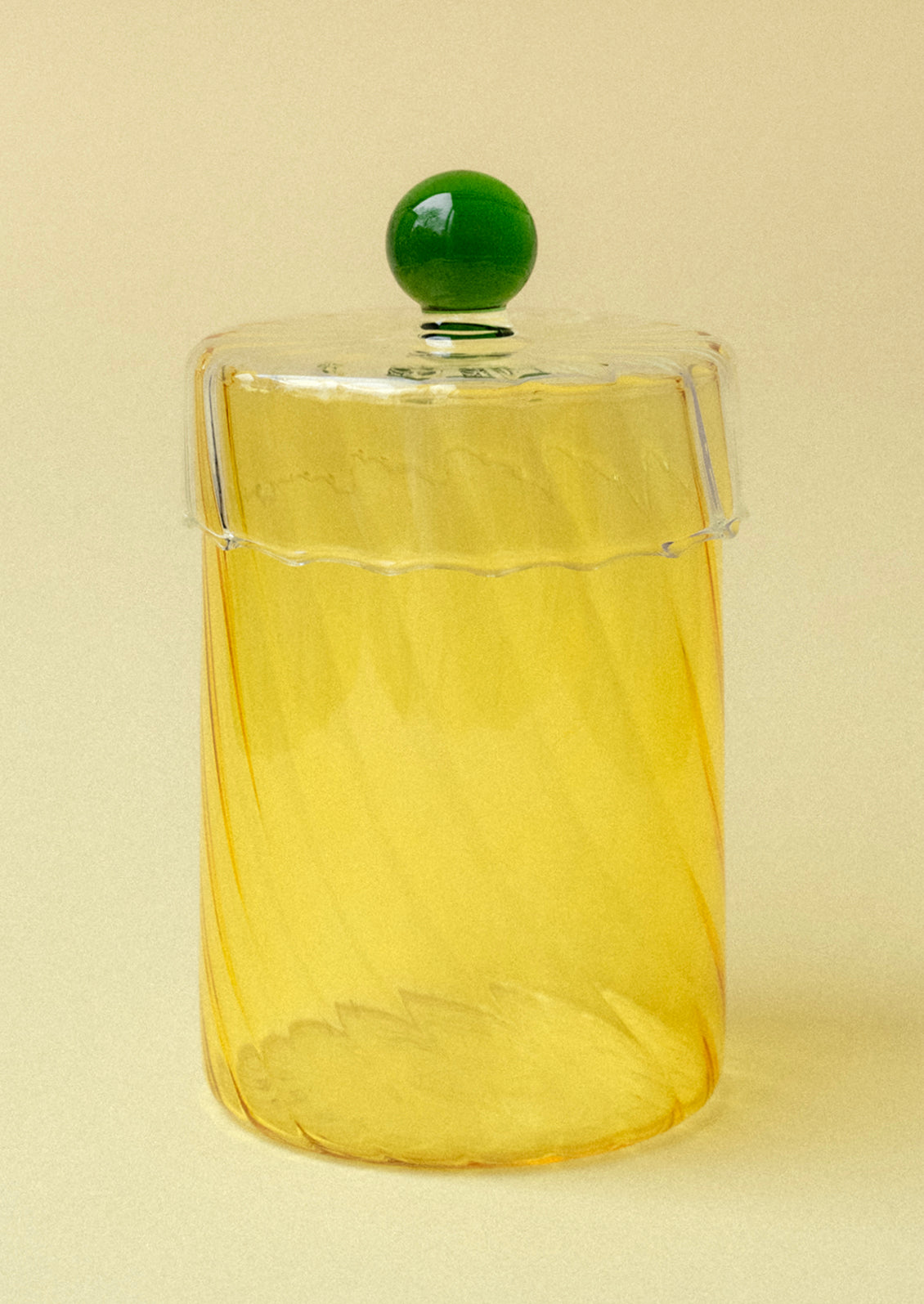 Showing off wavy, swirl textured glass, this colorful glass jar (with a tinted body and clear lid decorated with a colorful bauble-shaped knob) is perfect for candy, cotton balls, jewelry and more.