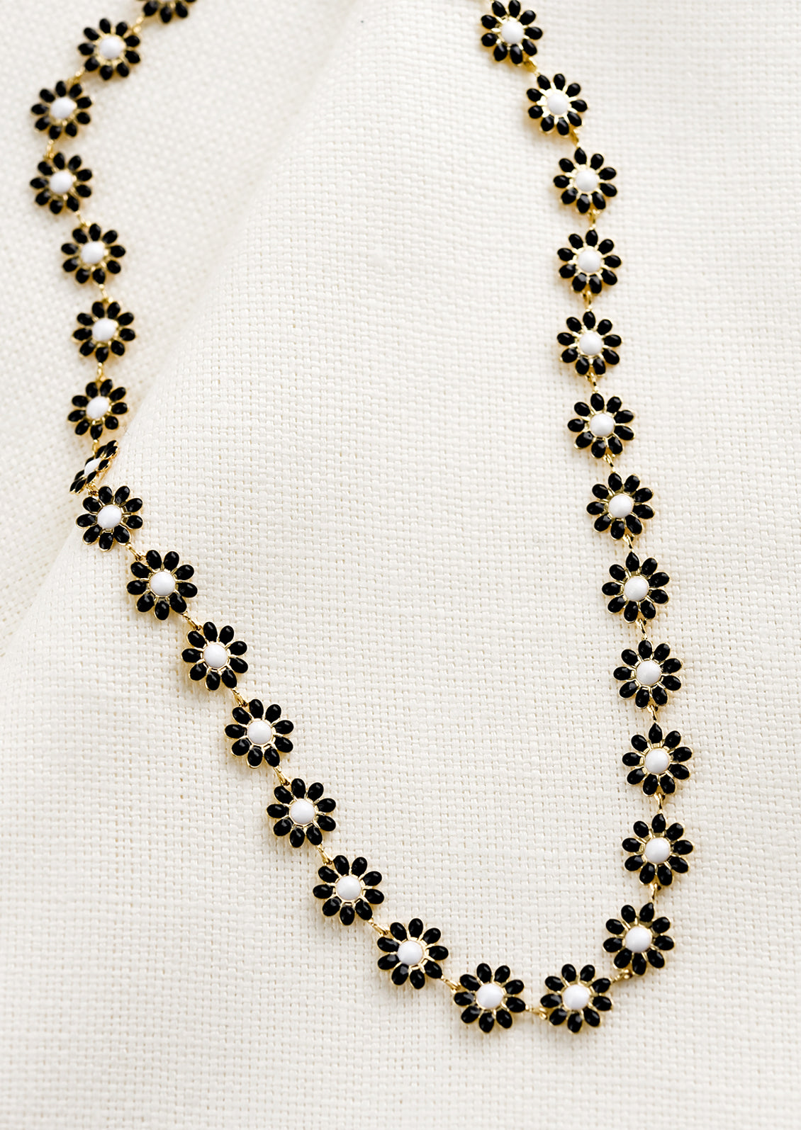 Playfully embracing 90's style (and maybe some 70's too), this enameled necklace shows off a bold lineup of two-tone florals.