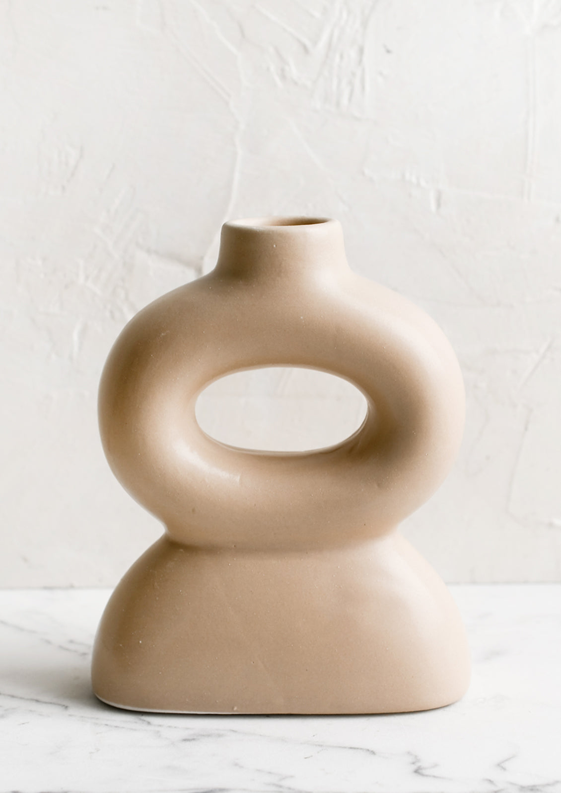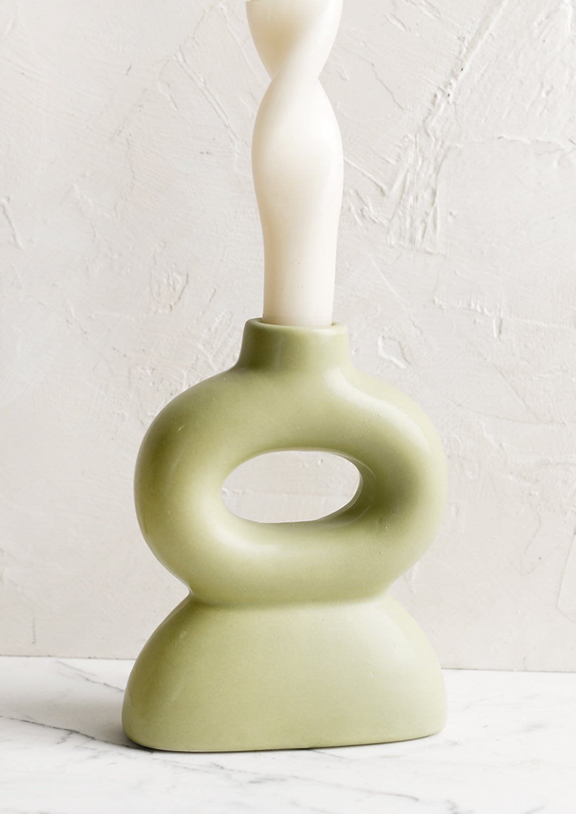 A curvy silhouette shows off a playful study in negative space on this ceramic taper holder, offered in two candy-like pastel hues.