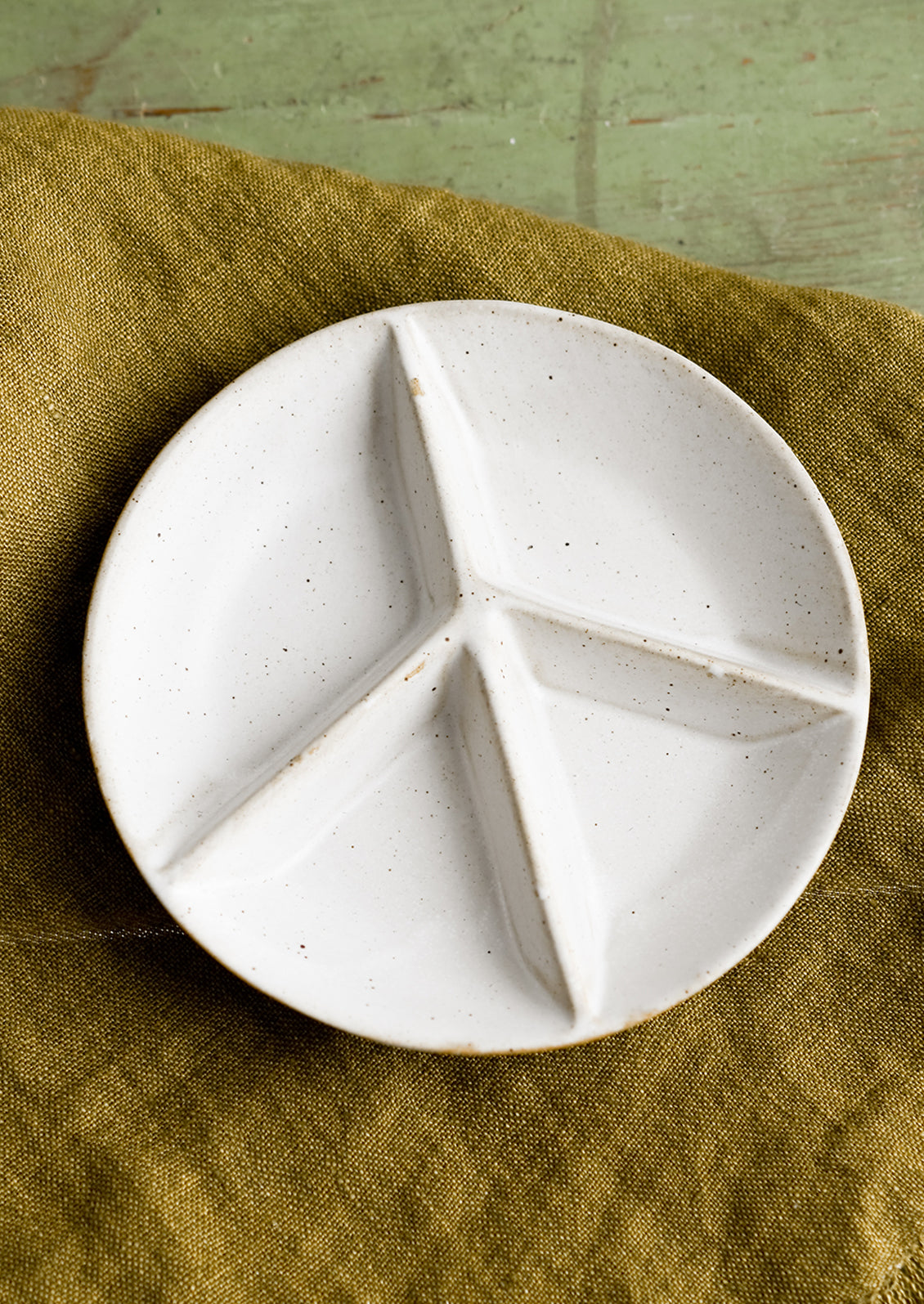 A peace sign divides this ceramic vessel into four individual compartments, whether for dividing up salts and sauces, or rings and earrings.