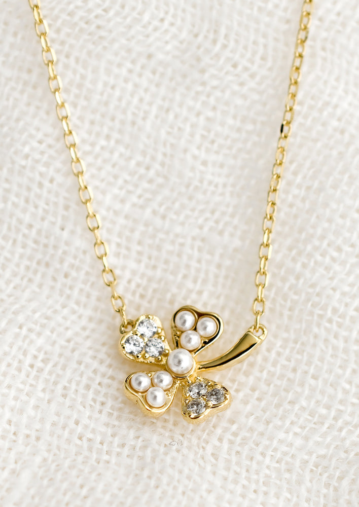A sweet clover pendant is studded with sparkling crystals and tiny pearls on this delicate golden necklace.
