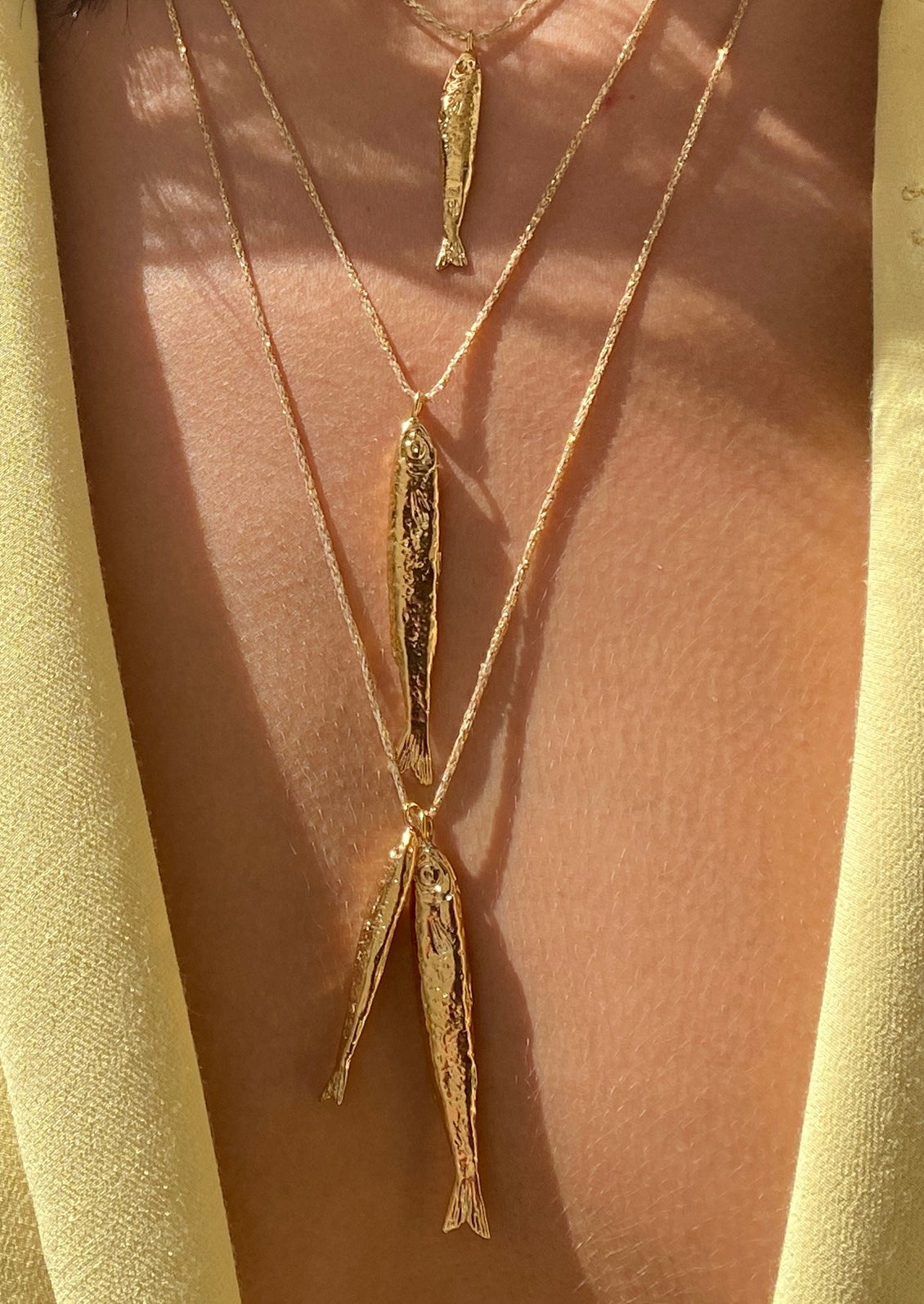 | Dimensions | One fish (small): 17.75" long, charm measures 1" long One fish (big): Adjustable length, charm measures 1.5" long Two fish: 35" long, charms measure 1.5" and 2" long |