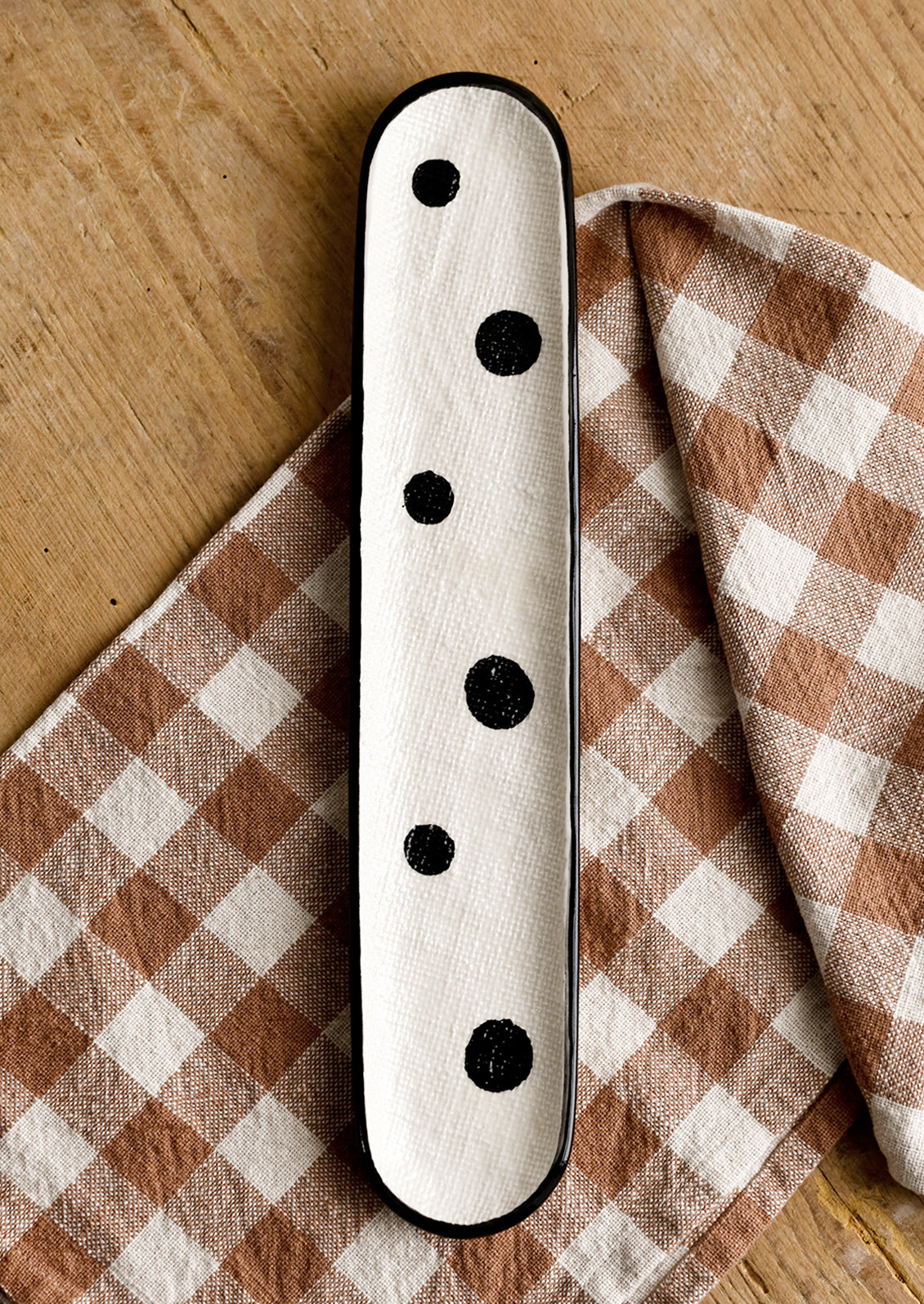Perfect for crostini, cheese or olives, this slim-silhouette tray shows off a monochrome polka dot print and a linen-like texture with a glossy glaze.