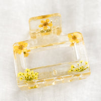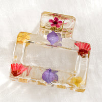 Real dried flowers are suspended inside clear resin on this whimsical hair claw, crafted in a wearable, compact square shape.