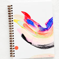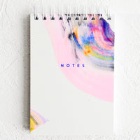Swirled swaths of paint in a rainbow span of hues decorate each painted cover on Moglea's vibrant notebook—its ruled pages are perfect for rambling musings and important plans.