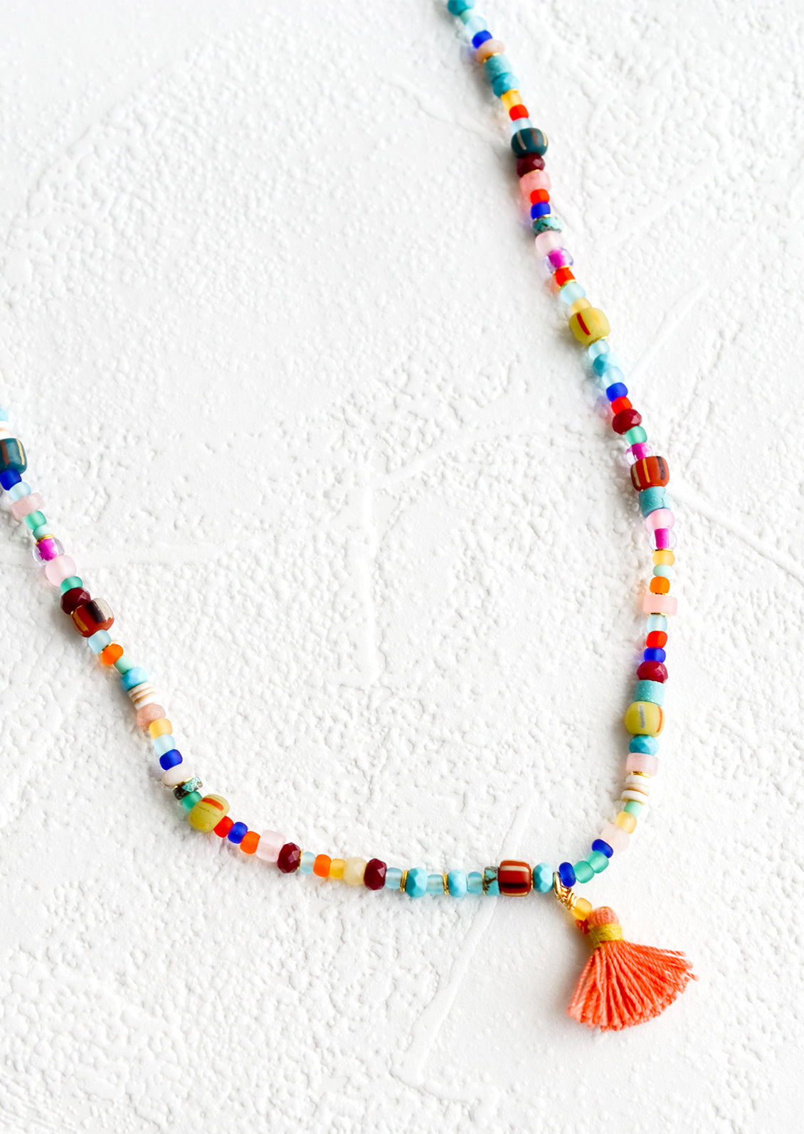 A long strand comprised of golden links and an eclectic mix of colorful beads, this cheery necklace (adorned with a single, peachy-hued tassel) can be worn long or doubled up for a layered look.