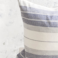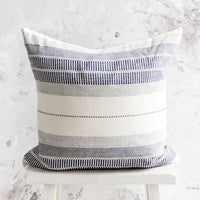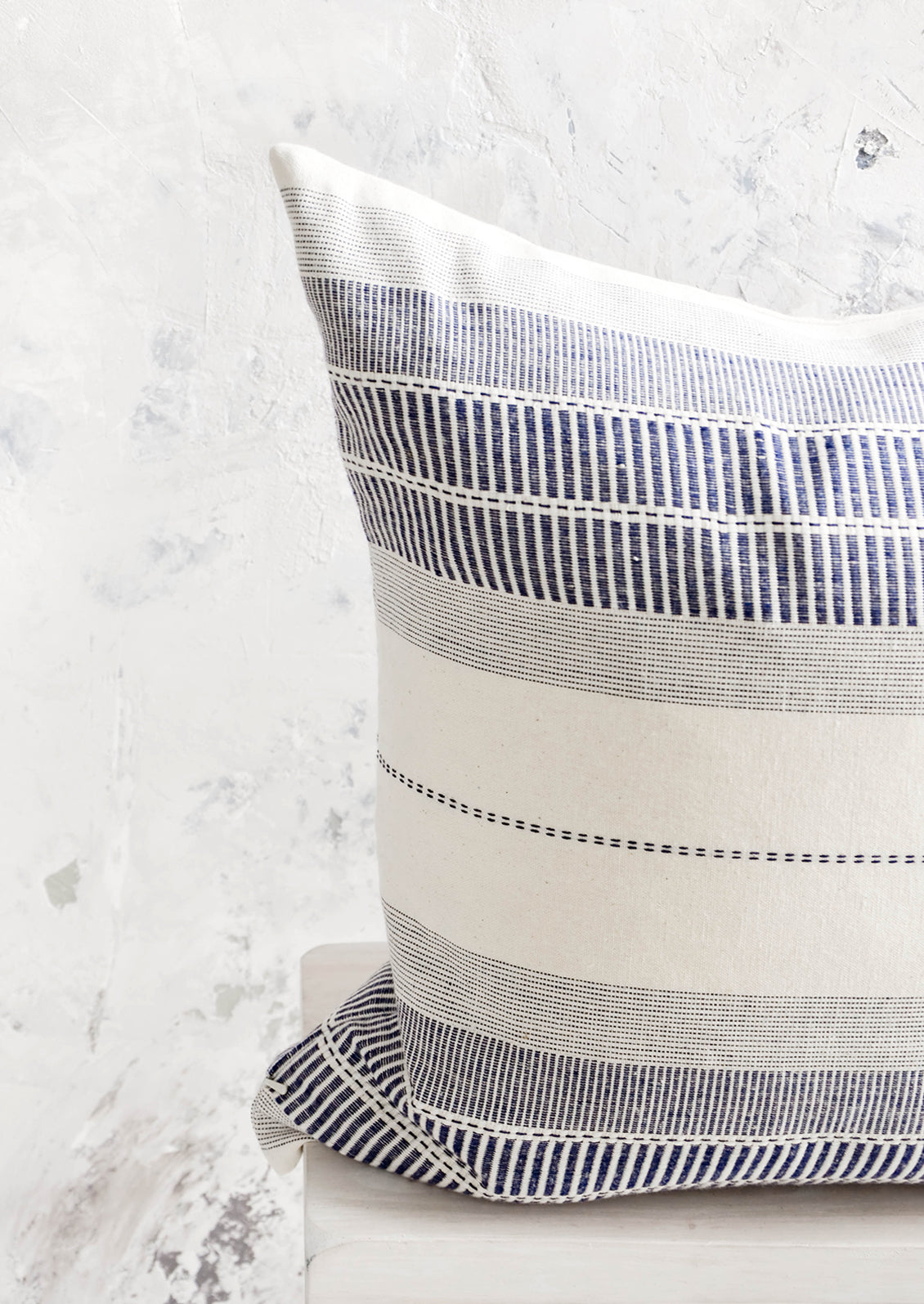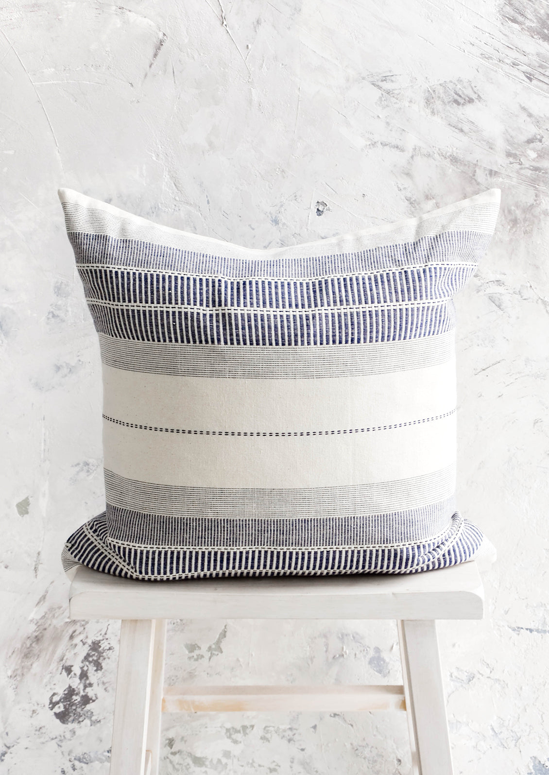 Striped embroidery detailing in a serene shade of blue gives a sophisticated look to this natural cotton pillow—the mix of styles in the stripes and the texture of the thread feel quite luxe.